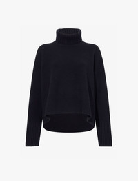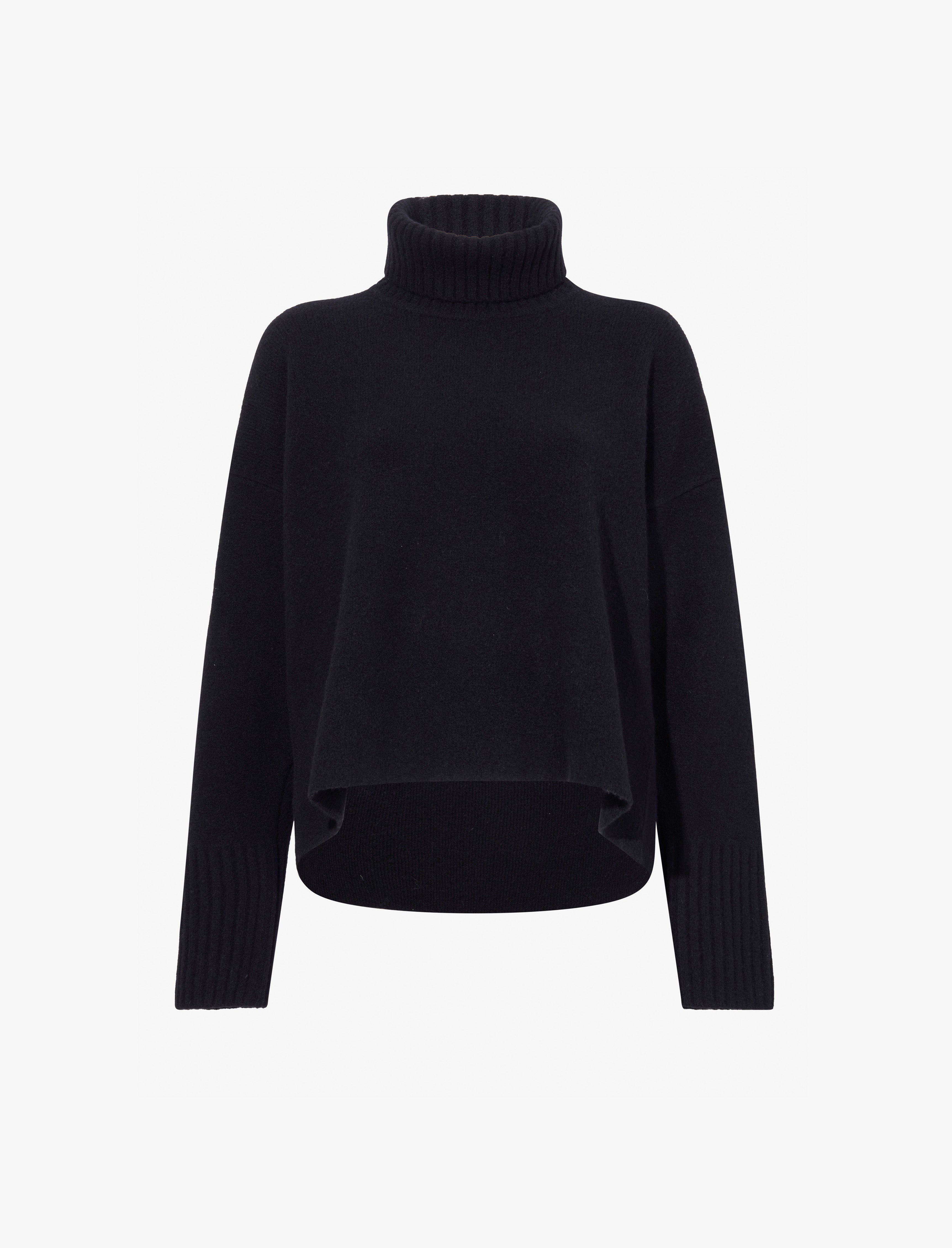 Fall 2024 Runway Collection | Look 33 The Sandra Turtleneck Sweater in Lofty Eco Cashmere is crafted in softly textured cashmere to a relaxed silhouette with drop shoulders. Completed with a rolled turtleneck and extended ribbed-knit sleeve trims. Details - Black - Softly textured knit - Rolled turtleneck - Drop shoulders - Ribbed-knit trims - Relaxed fit - SKU: R2447230KW150001 Size & Fit - Model is 5'9'' with 30'' bust / 34.5'' hips. Wearing size Small Care - Dry clean only