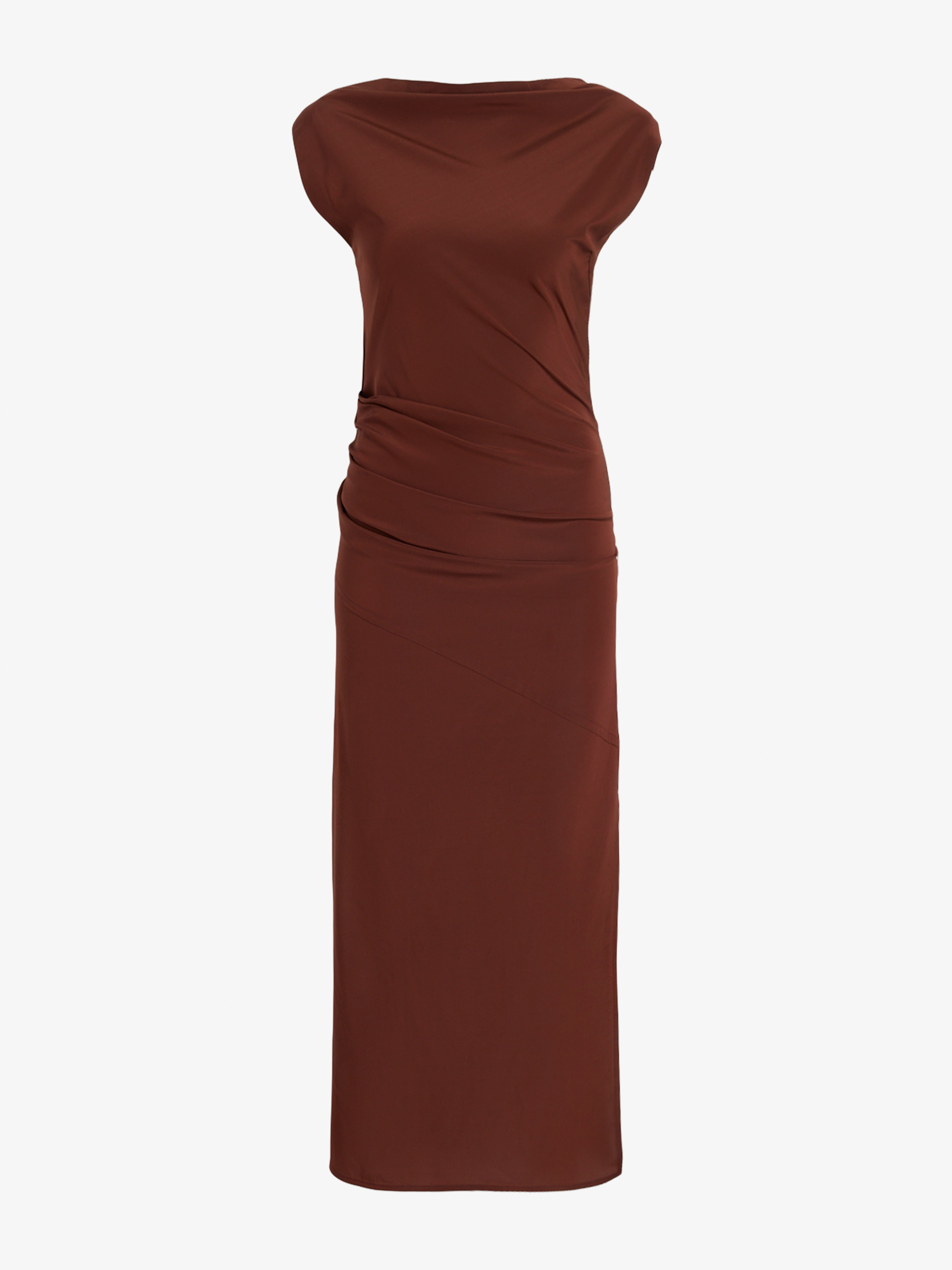 The Tasa Dress in Silk Viscose is crafted in a slim silhouette with an asymmetric neckline and a softly draped body. Finished with an ankle-grazing hem. Details - Mahogany - Draped asymmetric neckline - Cap sleeves - Gathered waist - Straight mid-length hem - Concealed zip fastening - Ankle-grazing hem - Slim fit - 70% triacetate, 30% polyester - SKU: R2543026BY297225 Size & Fit - Model is 5'10'' with 31'' bust / 34'' hips. Wearing size 4 Care - 70% triacetate, 30% polyester - Dry clean only