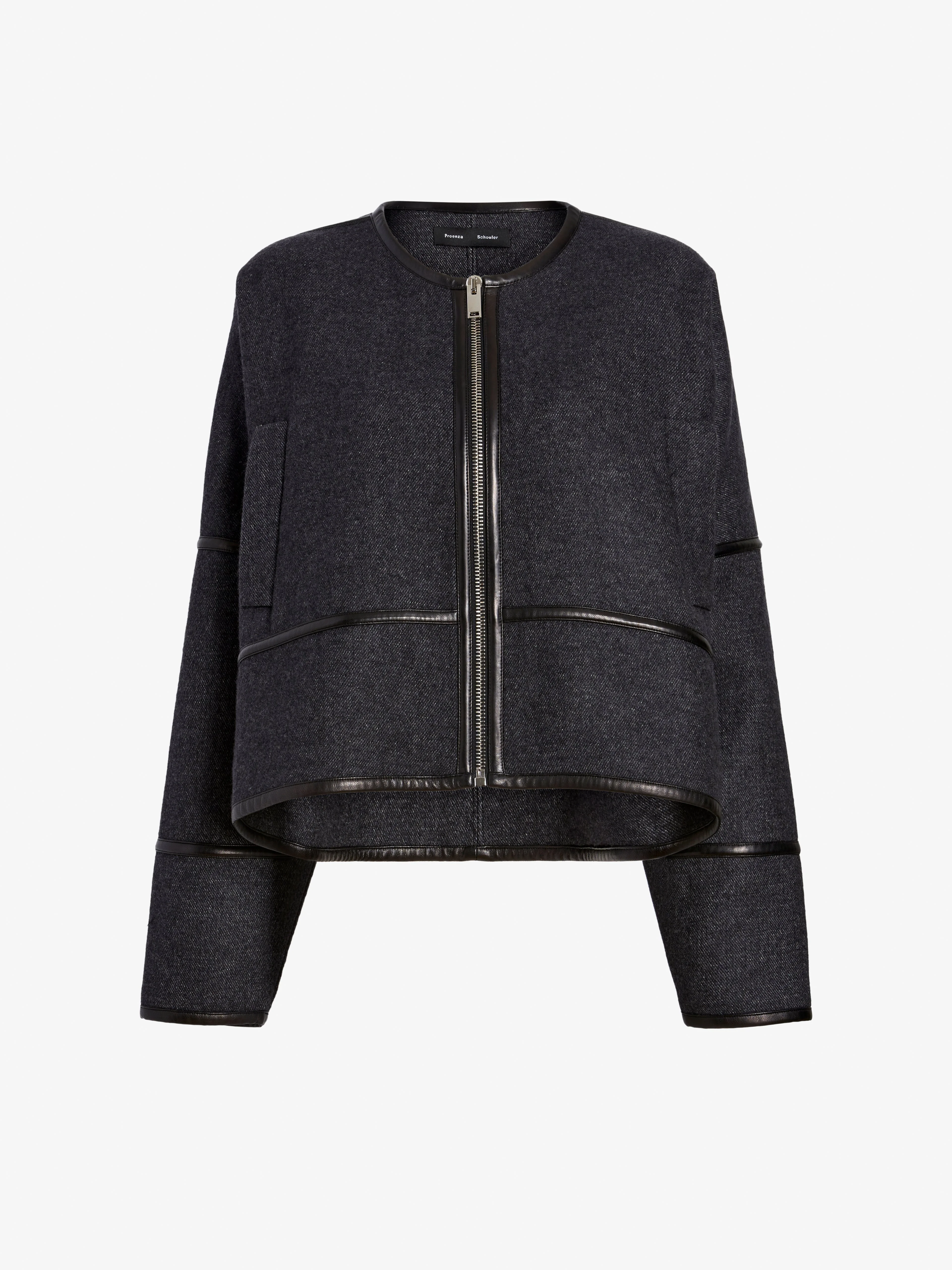 The Ticiana Jacket in Double Wool Twill is crafted to a cropped silhouette with a gentle swing through the body. Relaxed in fit, it features a silver-tone zipper fastening and leather trim detailing throughout. Details - Charcoal melange - Crew neckline - Long sleeves - Silver-tone zipper fastening - Welt pockets - Leather detailing - Cropped hem - Relaxed fit - Jacket: 84% wool, 16% polyester; Trims: 100% lambskin - SKU: R2612006AW146983 Size & Fit - Model is 5'10'' with 32'' bust / 34'' hips. Wearing size 4 Care - Jacket: 84% wool, 16% polyester; Trims: 100% lambskin - Dry clean only