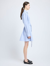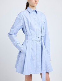 The Viola Dress in Stripe Cotton Silk Poplin is crafted to a mini-length silhouette with a point collar. Designed with wide loops around the waist, it includes a D-ring belt. Completed with fixed pleats along the front and back. Details - Pale blue multi - Point collar - Long sleeve - Button closures - Belt loops - D-ring belt - Button sleeve ends - Pleat details - Mini length - Slim fit - 82% cotton, 18% silk - SKU: R2523029SC101462 Size & Fit - Model is 5'11'' with 30'' bust / 35.5'' hips. Wearing size 4 Care - 82% cotton, 18% silk - Dry clean only