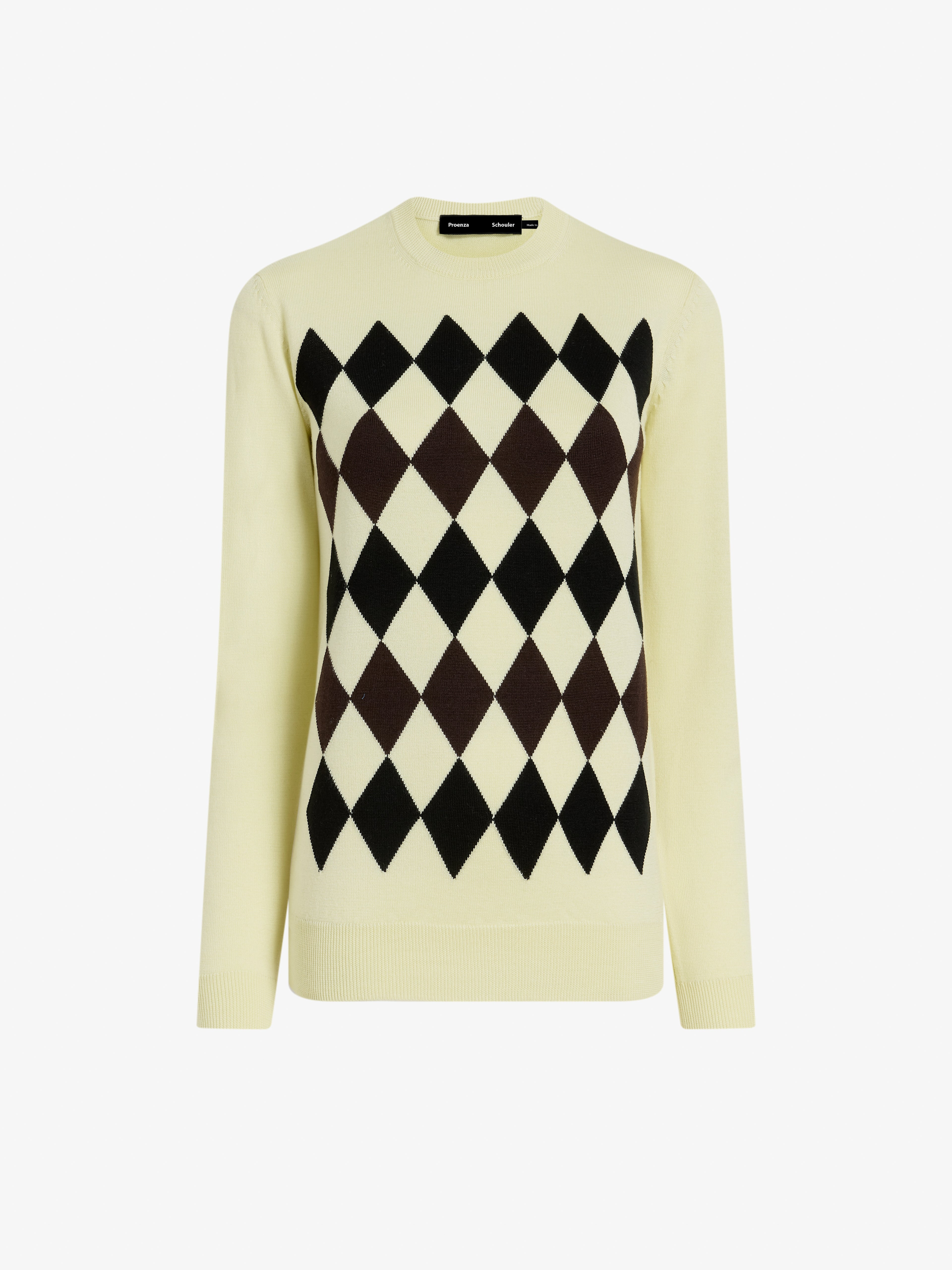 The Vivian Top in Argyle Knit is knitted in a tri-color argyle print, featuring a crew-neck silhouette complete with small ribbed trims. Details - Yellow multi - Lightweight - Argyle print - Crew neckline - Long sleeves - Ribbed-knit trims - Slim fit - 75% extrafine merino, 25% silk - SKU: R2547279KW190970 Size & Fit - Model is 5'11'' with 30'' bust / 35.5'' hips. Wearing size Small Care - 75% extrafine merino, 25% silk - Dry clean only
