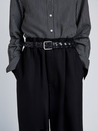The Wide Braid Belt in Croc Embossed Calf is hand-braided in Italy using vegetable-dyed calfskin. Features a silver-tone buckle and a small embossed monogram at the belt's end. Details - Black - Croc embossed - Vegetable dyed calfskin - Silver-tone buckle - Keeper strap - Hand braided in Italy - 100% calfskin - SKU: B254004C536S001 Care - Please refer to care instructions provided with your order.