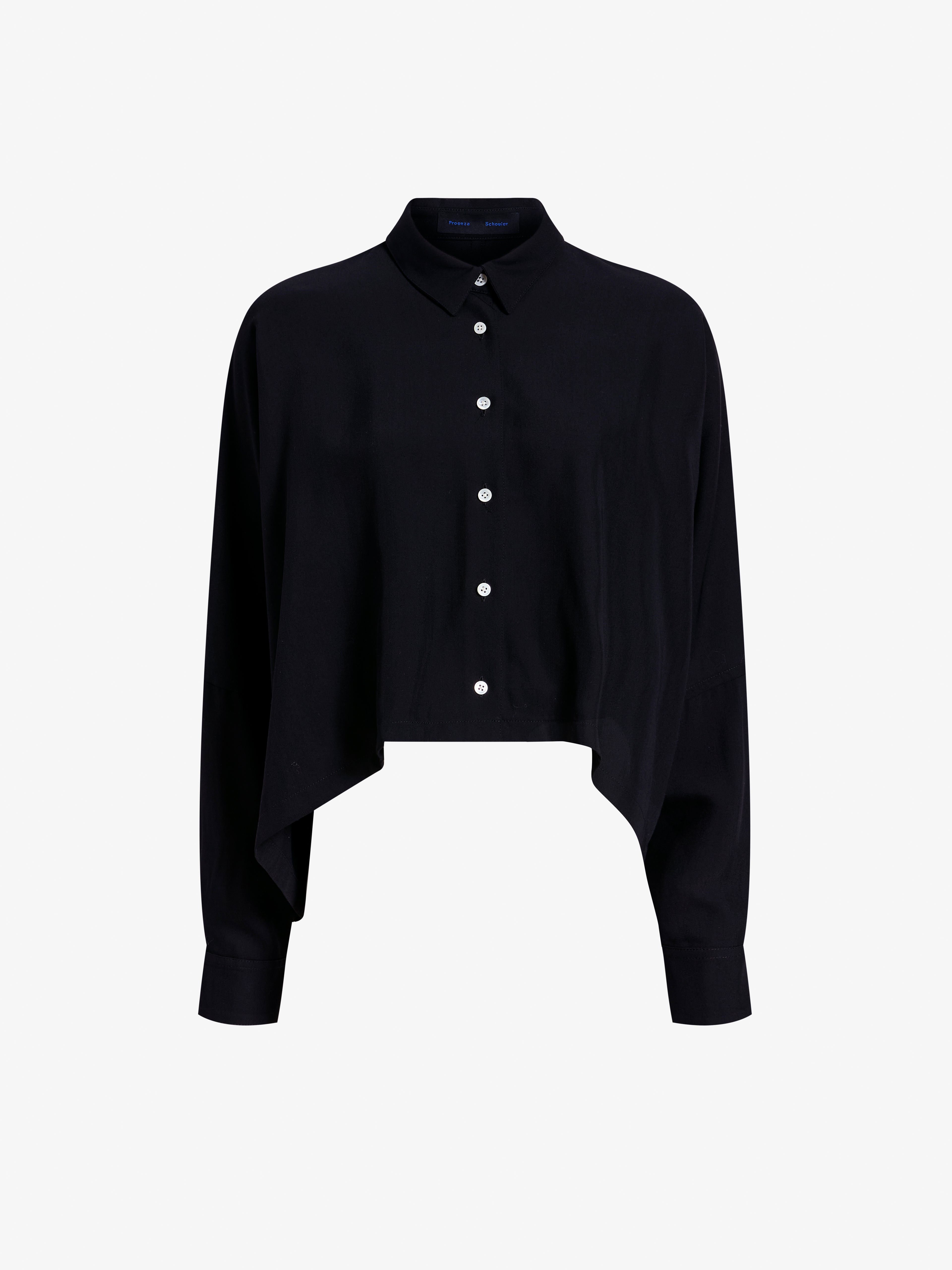 The Zad Top in Classic Twill features a swing-shaped silhouette with classic tailored detailing, completed with small contrast button fastenings. Details - Black - Point collar - Button fastenings - Relaxed fit - 79% viscose, 21% wool - SKU: R2544007AY213001 Size & Fit - Model is 5'10.5'' with 28'' bust / 34.5'' hips. Wearing size 4 Care - 79% viscose, 21% wool - Dry clean only