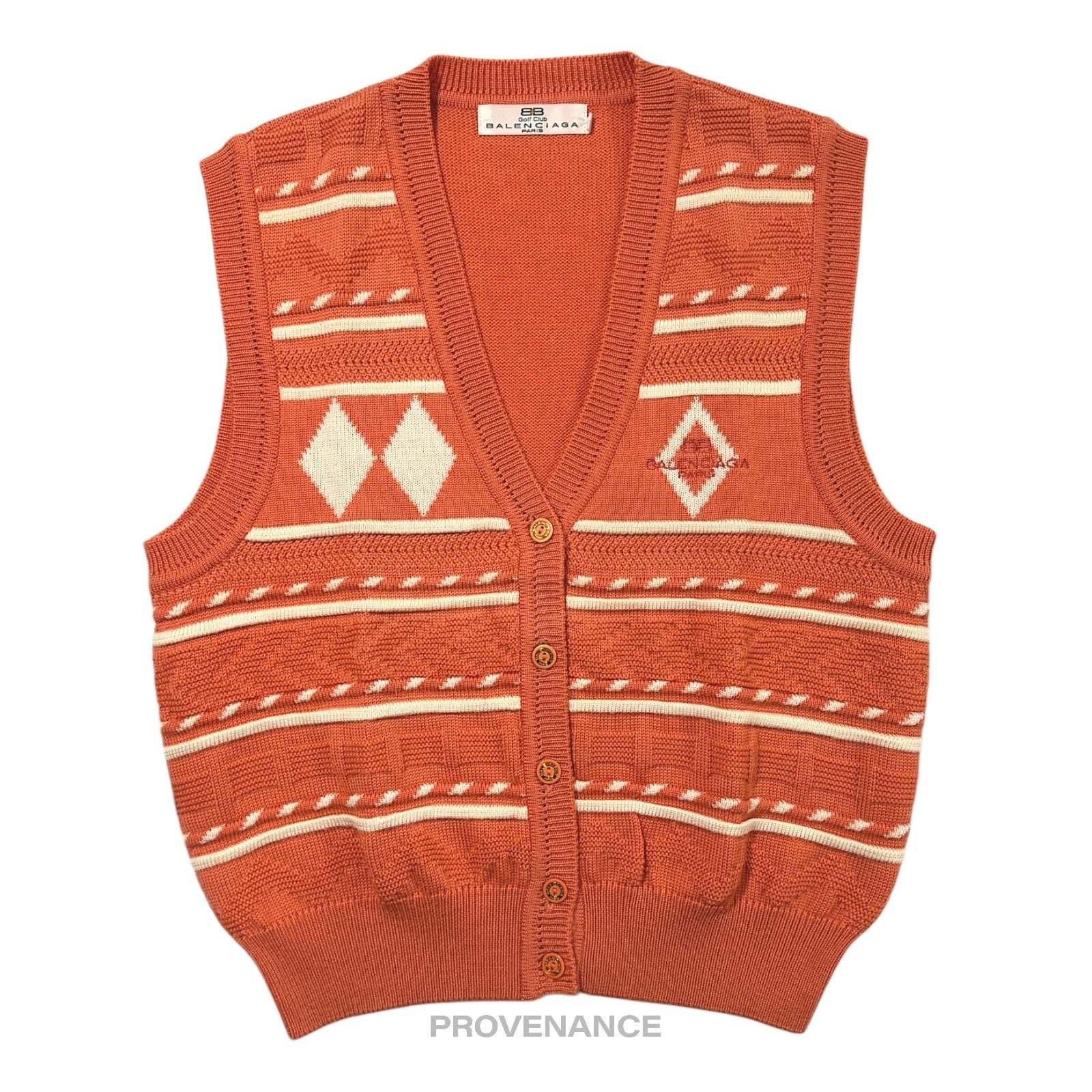 Balenciaga BB Logo Wool Sweater Vest - Orange/White L 100% Authentic - Money Back Guarantee Tagged Size: L Condition Notes: very minor signs of cosmetic wear professionally cleaned - BB Embroidered Monogram Logo - Geometric motifs - Button closure - 100% Wool FREE EXPRESS SHIPPING SAME-DAY SHIPPING HASSLE-FREE RETURNS