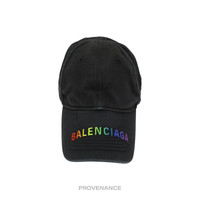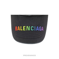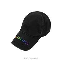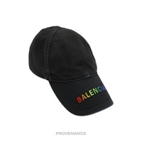 Balenciaga Embroidered Rainbow Logo Cap - Washed Black 100% Authentic - Money Back Guarantee Condition Notes: some signs of cosmetic wear professionally cleaned - Logo embroidered at brim in rainbow thread - Topstitched details and embroidered ventilation eyelets - Adjustable - 100% Cotton - Made in Italy Tagged Size- " L/58", Adjustable FREE EXPRESS SHIPPING SAME-DAY SHIPPING HASSLE-FREE RETURNS