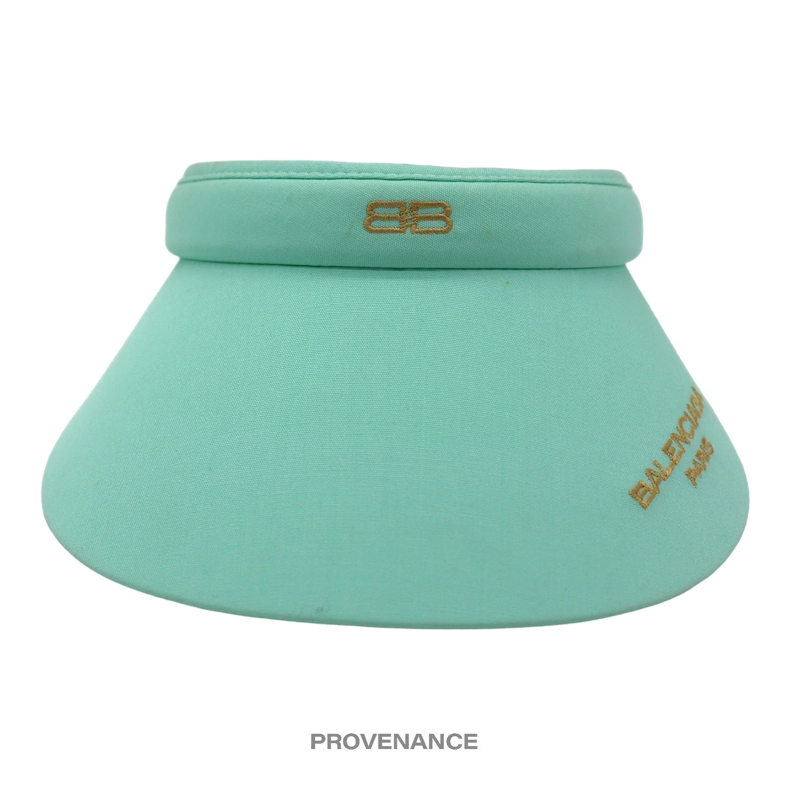 Balenciaga Gold Club Visor - Turquoise 100% Authentic - Money Back Guarantee Condition Notes: some signs of cosmetic wear professionally cleaned - Logo embroidered at front and brim in gold - 100% Cotton - One size, adjustable - Padded headband ONE SIZE FREE EXPRESS SHIPPING SHIPS WITHIN 24HR. HASSLE-FREE RETURNS