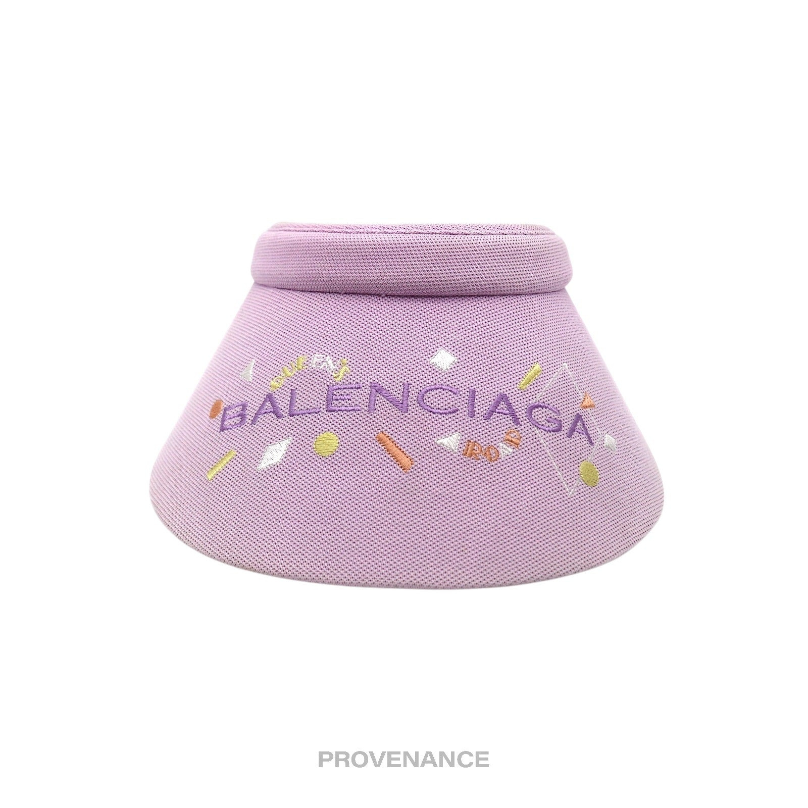 Balenciaga Logo Embroidered Visor - Lavender Geometric 100% Authentic - Money Back Guarantee Condition Notes: some signs of cosmetic wear professionally cleaned ONE SIZE - Balenciaga Logo and Geometric motif embroidered at brim - One size, adjustable - Padded headband - 100% Cotton FREE EXPRESS SHIPPING SAME-DAY SHIPPING HASSLE-FREE RETURNS