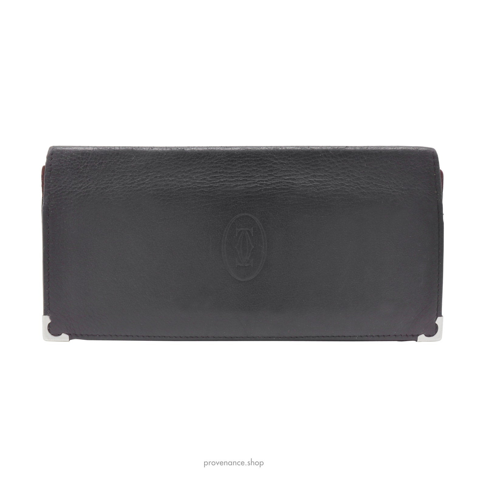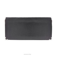 Cartier Long Wallet - Black Calfskin Leather 100% Authentic - Money-Back Guarantee Condition Notes: some signs of cosmetic wear some surface cracking at spine - 7 card slots - 3 utility compartments - Supple calfskin leather - Palladium hardware - Cartier insignia debossed at exterior FREE EXPRESS SHIPPING SHIPS WITHIN 24HR.