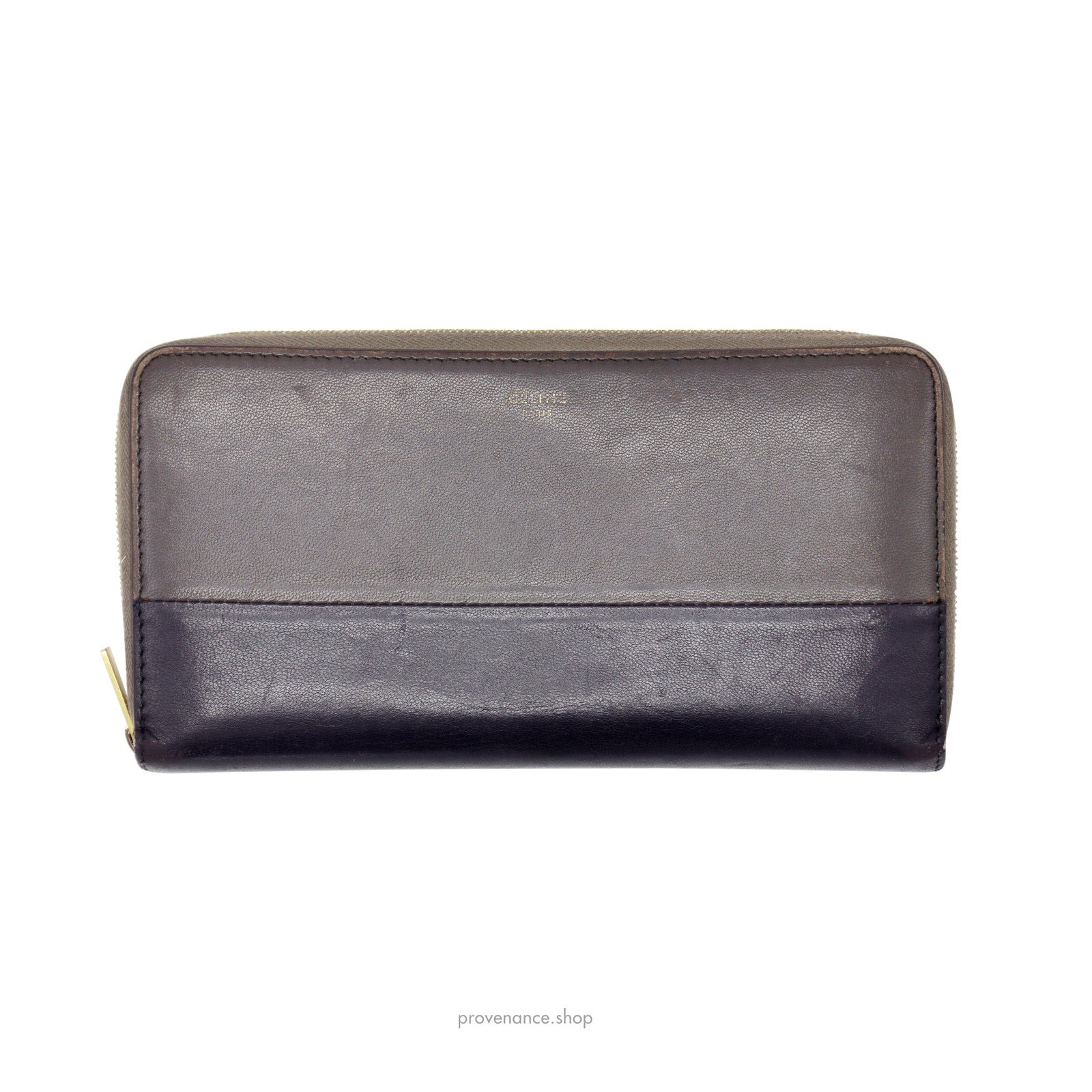 Celine x Phoebe Philo - Multifunction Zip Wallet in Grey/Black 100% Authentic - Money Back Guarantee Condition Notes: some signs of cosmetic wear - Stunning two-tone calfskin exterior - Tonal leather interior - 12 interior card slots - 2 interior card slots - 1 zipped compartment - Zip closure - Gold hardware FREE EXPRESS SHIPPING SHIPS WITHIN 24HR.