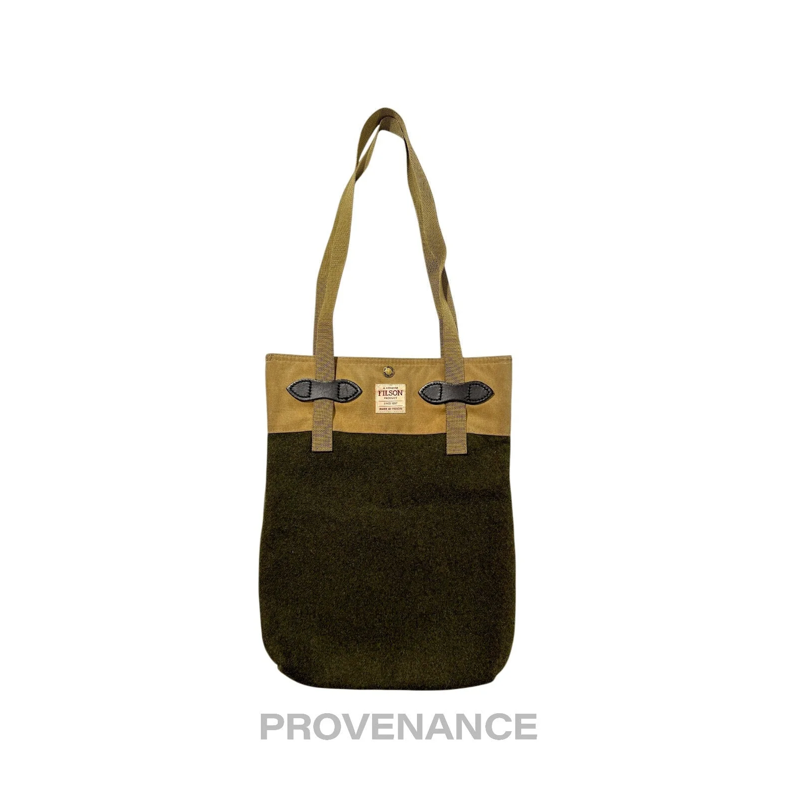 Filson Tin Cloth & Mackinaw Wool Tote Bag Tan Olive Moss Bridle 100% Authentic - Money Back Guarantee Condition Notes: Excellent pre-owned condition no rips, holes or stains clean interior Professionally cleaned Size: One Size (Approx. 14" W x 14" H x 5" D) Rare Archival "Mixed Material" Design Top: 15-oz. Oil Finish Tin Cloth (Tan) / Bottom: 24-oz. Mackinaw Wool (Forest Green) Durable Cotton Webbing handles Snap-top closure Made in USA From Filson's website (Archival): A rare seasonal variation on the classic field tote, this bag combines Filson’s legendary weather-resistant fabrics. The bottom is constructed from 24-oz. Virgin Mackinaw Wool—providing warmth, texture, and silence in the field. The top is built from Filson's iconic "Oil Finish Tin Cloth," a waxed cotton canvas that is incredibly durable yet lighter weight than Rugged Twill. Designed for easy carry, this tote features high-density cotton webbing handles that grip the shoulder without slipping. A heavy-duty snap closure at the top keeps your gear secure. The Tin Cloth upper offers superior water resistance, protecting the contents from rain or splashes. Made with 100% virgin Mackinaw Wool and Oil Finish Tin Cloth Cotton webbing handles for comfortable carry Open main compartment with snap-top closure Water-repellent and abrasion-resistant Lighter weight than standard Rugged Twill totes USAGE Everyday, Travel, Field, Workwear CARE Wipe or brush clean (Do not wash Tin Cloth) ORIGIN Made in USA. FREE EXPRESS SHIPPING SAME-DAY SHIPPING HASSLE-FREE RETURNS