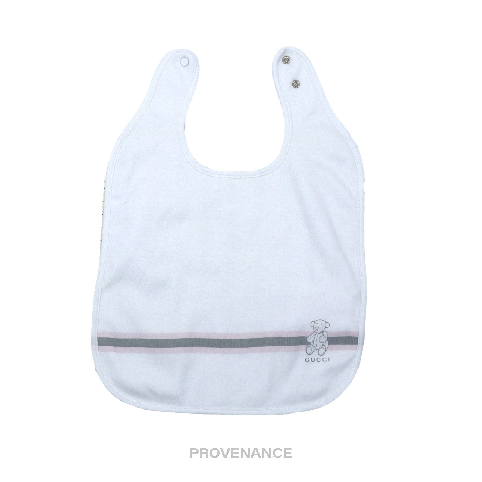 Gucci Baby Bib - Teddy Bear Web Stripe White Pink Grey 100% Authentic - Money-Back Guarantee Condition Notes: very minor signs of cosmetic wear professionally cleaned - Gucci Teddy Bear motif at obverse, - Pure white at reverse - 100% cotton - Snap closure - Made in Italy Tagged Size: 26.5 x 35 cm. FREE EXPRESS SHIPPING SAME-DAY SHIPPING. HASSLE-FREE RETURNS