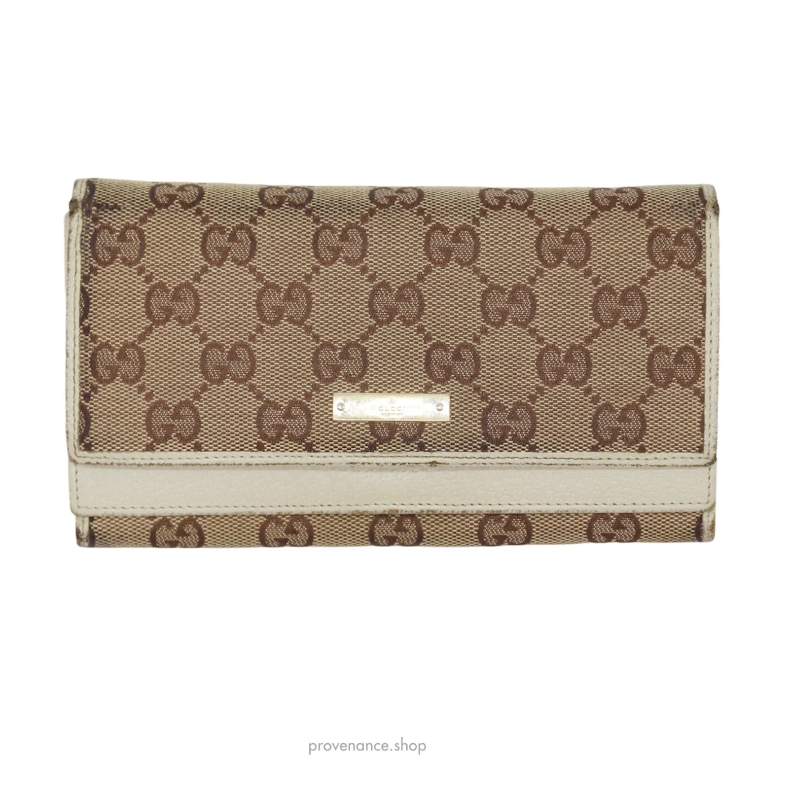 Gucci GG Canvas Long Wallet - White 100% Authentic - Money-Back Guarantee Condition Notes: some signs of cosmetic wear - Classic GG canvas - White leather trim - 7 card slots - 2 utility compartments - 1 zipped compartment - 1 frosted ID window - Snap-closure FREE EXPRESS SHIPPING SHIPS WITHIN 24HR.