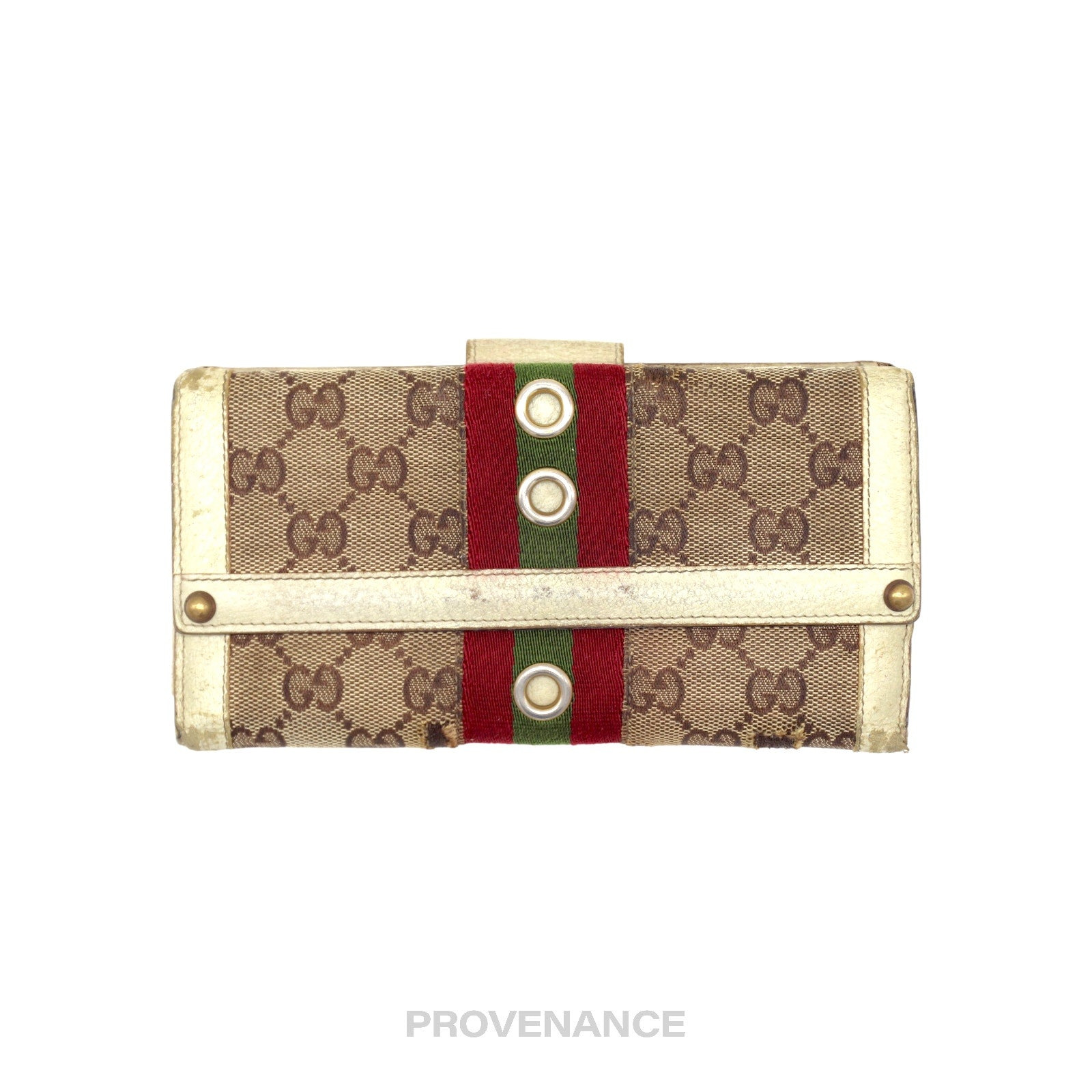 Gucci GG Canvas Long Wallet - White with Web 100% Authentic - Money Back Guarantee Condition Notes: some signs of cosmetic wear - Classic GG canvas - White leather trim - 7 card slots - 2 utility compartments - 1 snap-closure compartment - Snap-closure - Gold hardware - Made in Italy FREE EXPRESS SHIPPING SHIPS WITHIN 24HR. HASSLE-FREE RETURNS