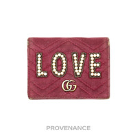 Gucci GG Marmont Card Holder Wallet - LOVE Pink Quilted 100% Authentic - Money-Back Guarantee Condition Notes: some signs of cosmetic wear - Velvet Matelasse Pearl Love Embroidered at exterior - GG Marmont icon in metal at exterior - Tonal leather lining - 4 card slots - 2 interior utility slot - Gold hardware - Made in Italy FREE EXPRESS SHIPPING SAME-DAY SHIPPING HASSLE-FREE RETURNS