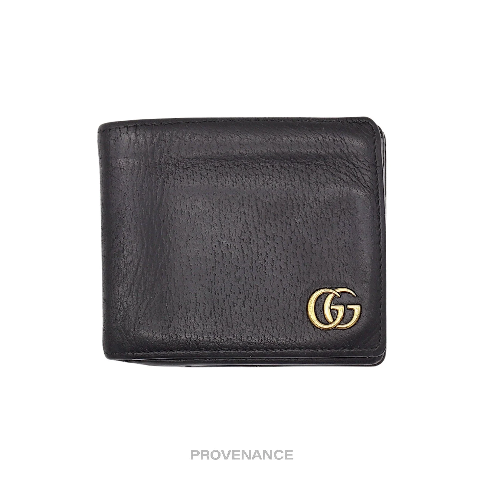 Gucci GG Marmont Bifold Wallet - Black Leather 100% Authentic - Money Back Guarantee Condition Notes: some signs of cosmetic wear some coin compartment lining wear From the Gucci website: "A bi-fold wallet, distinguished by our signature Double G hardware. Made in calfskin leather heat-stamped to achieve a boar effect, giving it a textured appearance. - Black metal-free tanned leather - 6 card slots - 2 compartments for bills - 2 utility compartments - Single gusseted snap-closure compartment - Tonal leather lining - Made in Italy Measurement: Open: 8.25"W x 3.5"H Closed: 4.3"W x 3.5"H FREE EXPRESS SHIPPING SAME-DAY SHIPPING HASSLE-FREE RETURNS