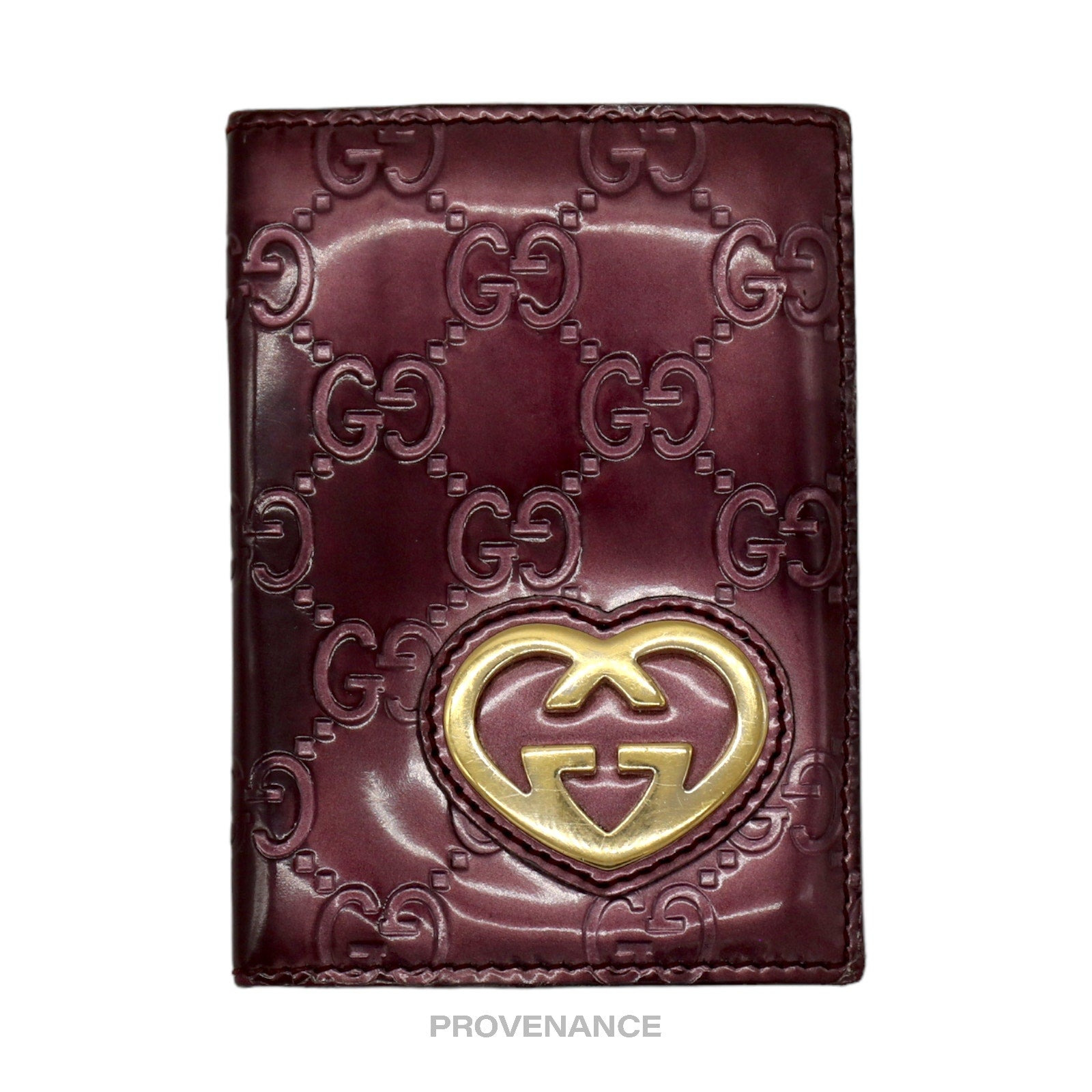 Gucci Heart Pocket Organizer Wallet - Patent Metallic Red Guccissima Leather 100% Authentic - Money Back Guarantee Condition Notes: some signs of cosmetic wear - GG Heart in metal at exterior - 1 external card slot - 3 internal card slots - 1 internal frosted ID window - Made in Italy FREE EXPRESS SHIPPING SHIPS WITHIN 24HR. HASSLE-FREE RETURNS