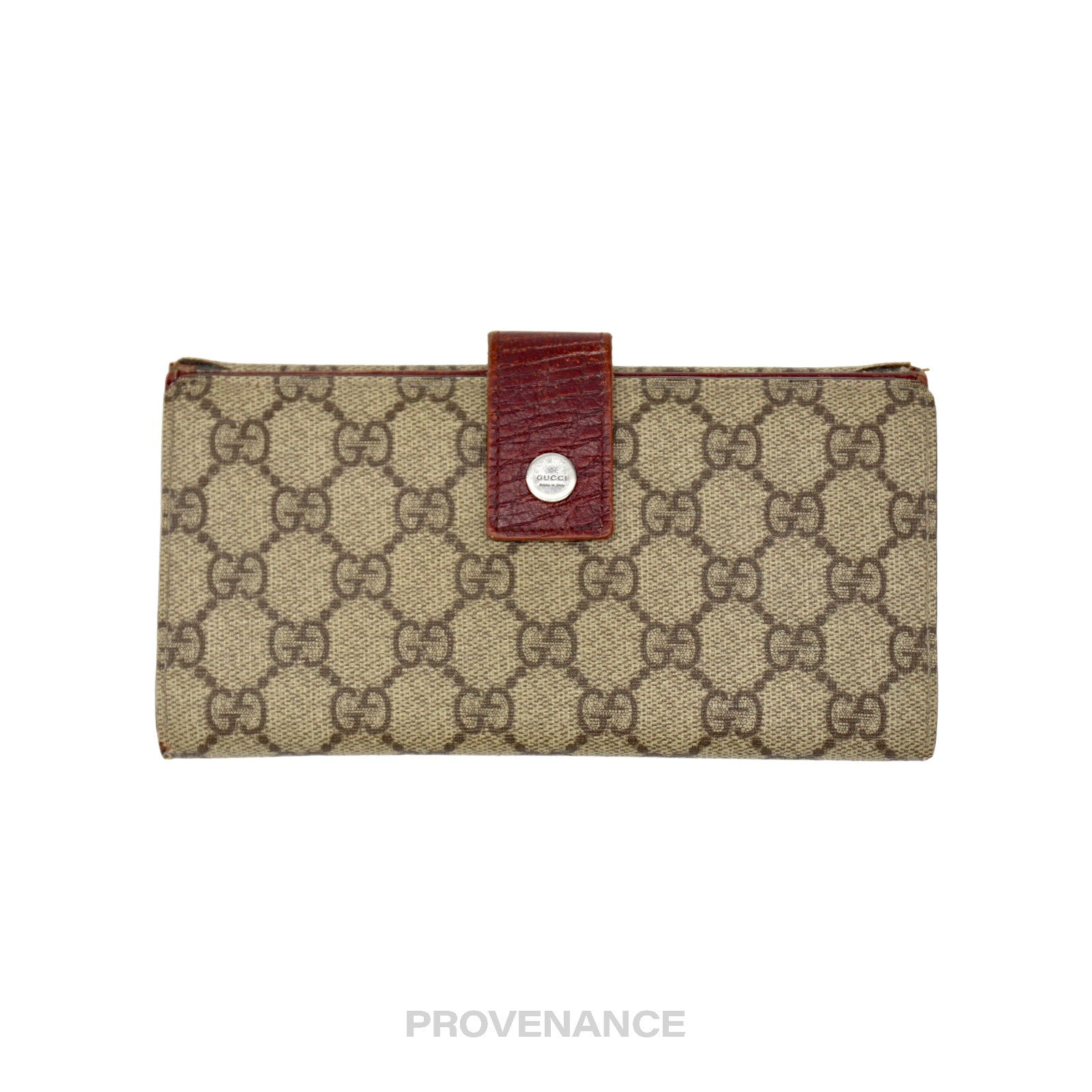 Gucci Long Wallet - GG Supreme Red 100% Authentic - Money Back Guarantee Condition Notes: some signs of cosmetic wear some corner wear - 6 card slots - 2 utility compartment - 1 snap slot - Tonal leather lining FREE EXPRESS SHIPPING SHIPS WITHIN 24HR. HASSLE-FREE RETURNS