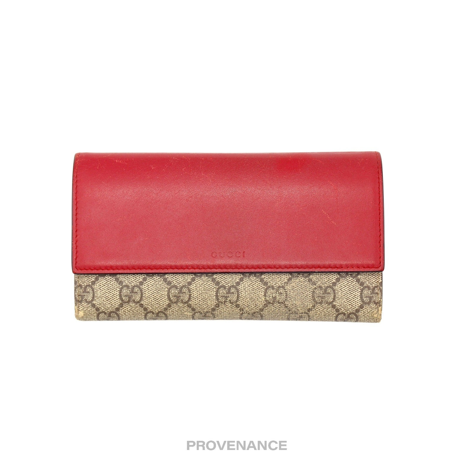 Gucci Snap Long Wallet - GG Supreme Red Pink 100% Authentic - Money Back Guarantee Condition Notes: some signs of cosmetic wear - Classic GG canvas - 12 card slots - 2 utility compartments - 1 zipped compartment - Snap-closure - Gold hardware - Made in Italy FREE EXPRESS SHIPPING SAME-DAY SHIPPING HASSLE-FREE RETURNS