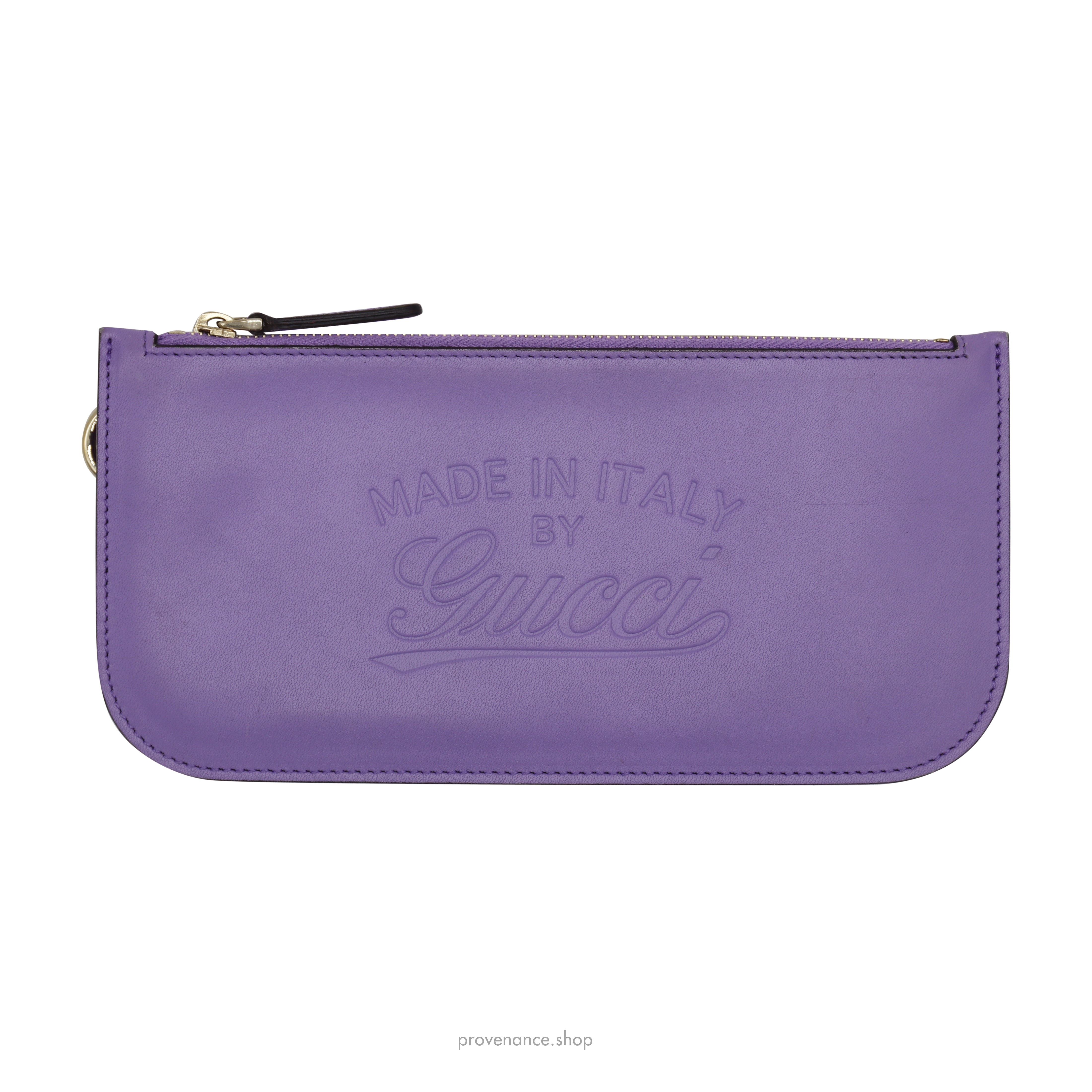 Gucci Zip Pouch - Lavender Leather Condition Notes: Unused condition - "Made in Italy by Gucci" debossed at exterior - Supple Lavender calf leather - Textile lining - Zip closure - Gold hardware - D-Ring FREE EXPRESS SHIPPING SHIPS WITHIN 24HR.