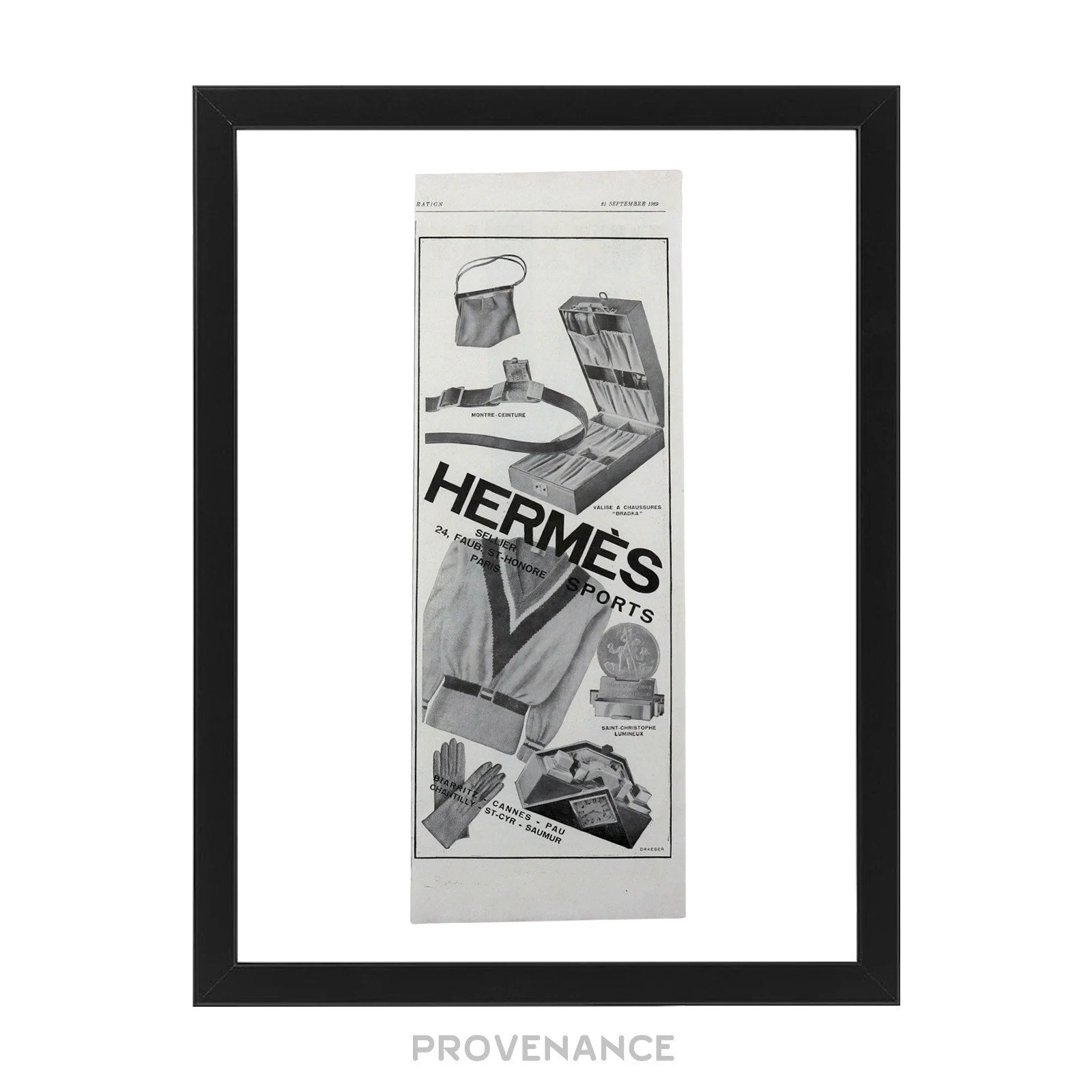 Hermes Antique Vintage Newsprint Ad - Hermes Sports 100% Authentic - Money Back Guarantee IDEAL INVESTMENT FOR ELEVATED HOME STAGING AND DECORATION Condition Notes: Professionally framed with archival materials Condition of printed matter excellent and consistent with age - Genuine c. 1929 vintage antique Hermes advertisement - Highly collectible, very few surviving pieces worldwide - Black ink on newsprint - Highly collectible Framed Dimensions: 41 x 31 x 1 cm. Please note that in order to preserve the item in optimal storage conditions, this piece is framed-to-order. Please allow 1-2 days for fulfillment. FREE EXPRESS SHIPPING HASSLE-FREE RETURNS