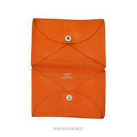 Hermes Calvi Card Wallet - Orange Chevre Mysore Leather 100% Authentic - Money Back Guarantee Condition Notes: some signs of general wear - Chevre Mysore Goatskin - 2 card compartments - snap closure - Made in France Measures 3.3" long x 3.1" high FREE EXPRESS SHIPPING SAME-DAY SHIPPING HASSLE-FREE RETURNS