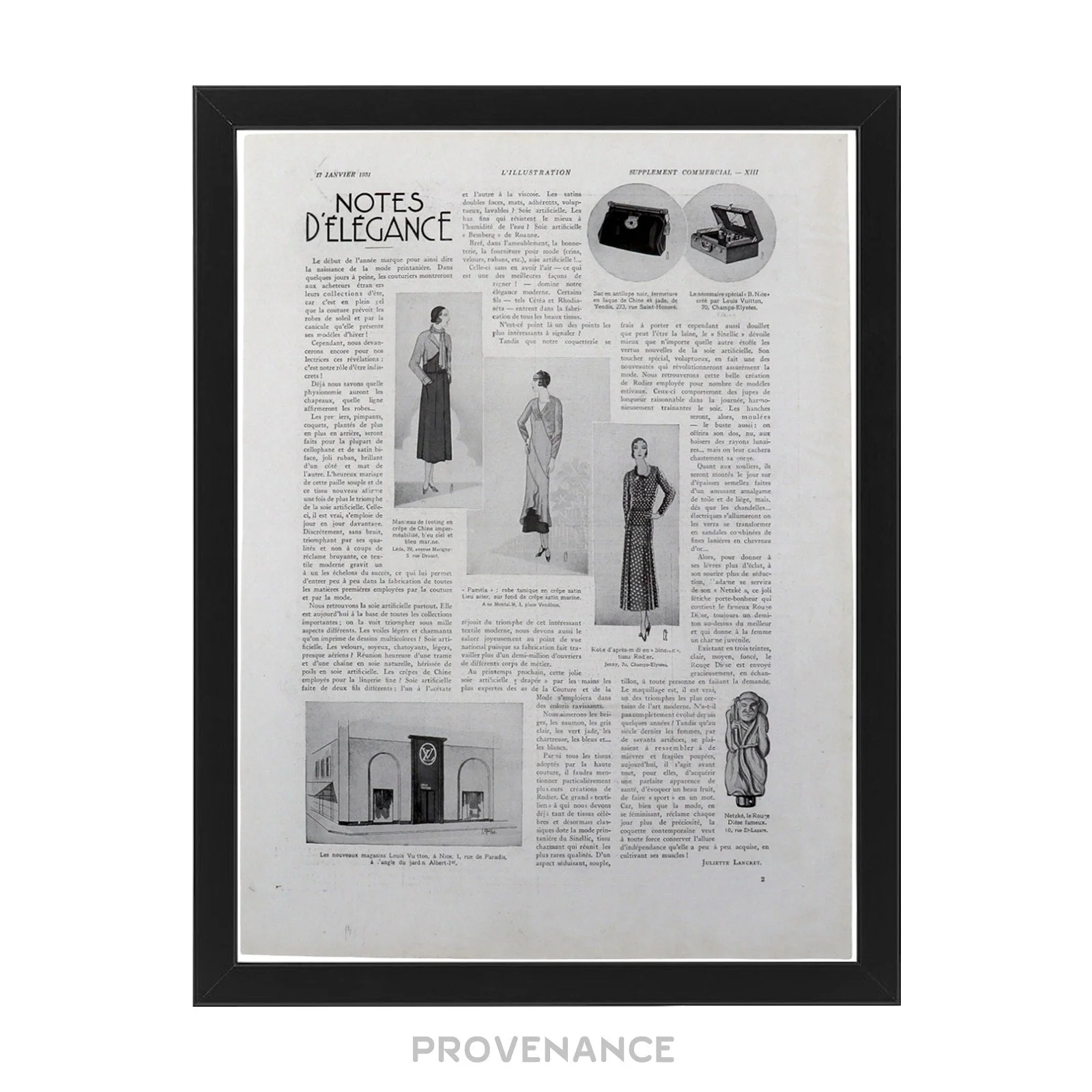 Louis Vuitton Antique Vintage Newsprint Ad - NOTES D'ELEGANCE ii 100% Authentic - Money Back Guarantee IDEAL INVESTMENT FOR ELEVATED HOME STAGING AND DECORATION Condition Notes: Professionally framed with archival materials Condition of printed matter excellent and consistent with age - Genuine c. 1931 vintage antique Louis Vuitton advertisement - Highly collectible, very few surviving pieces worldwide - Black ink on newsprint - Highly collectible Framed Dimensions: 41 x 31 x 1 cm. Please note that in order to preserve the item in optimal storage conditions, this piece is framed-to-order. Please allow 1-2 days for fulfillment. FREE EXPRESS SHIPPING HASSLE-FREE RETURNS