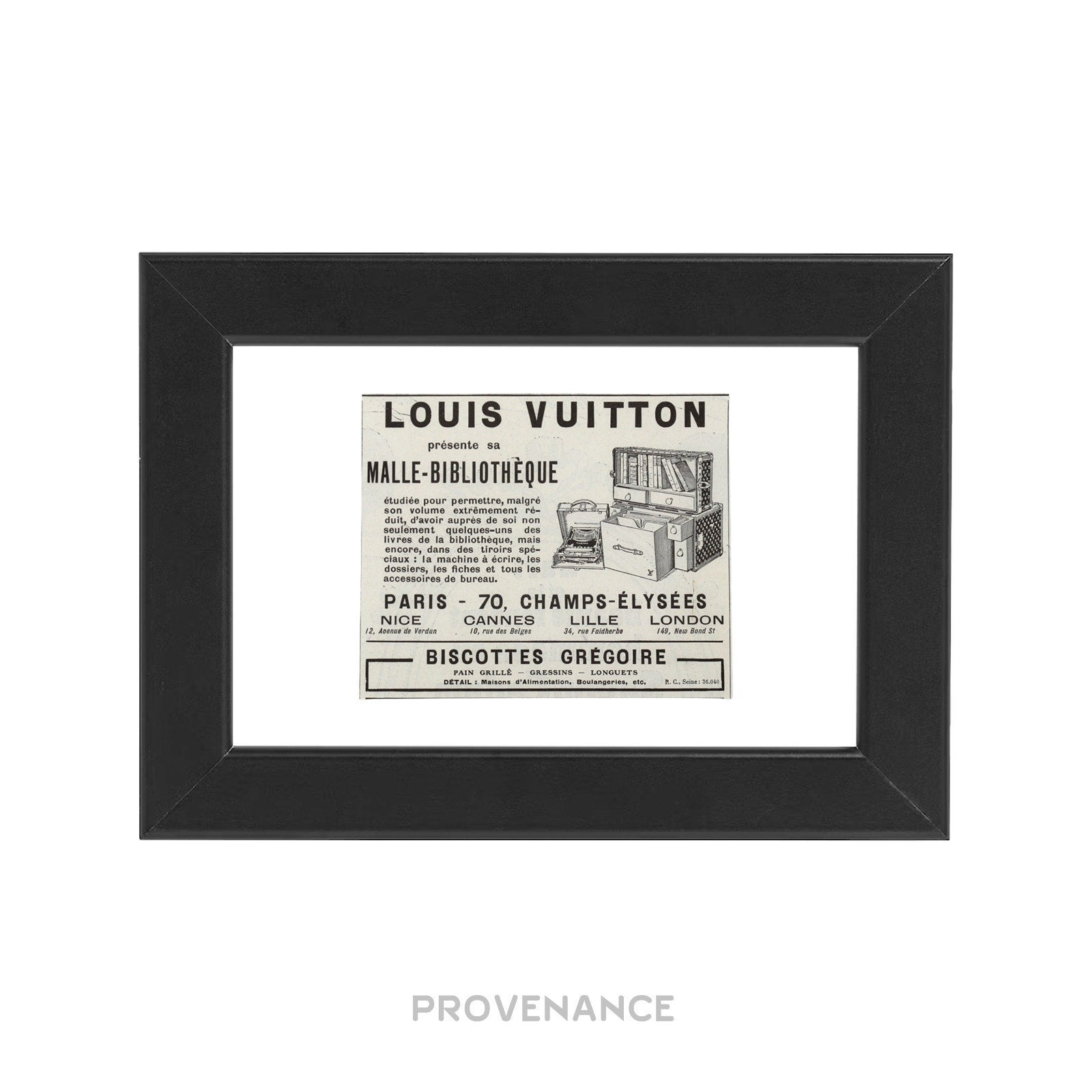 Louis Vuitton Antique Vintage Newsprint Ad - LIBRARY TRUNK 100% Authentic - Money Back Guarantee RARE SMALL FORMAT ANTIQUE LOUIS VUITTON ADVERTISEMENT IDEAL INVESTMENT FOR ELEVATED HOME STAGING AND DECORATION Condition Notes: Professionally framed with archival materials Condition of printed matter excellent and consistent with age - Genuine c. 1920's vintage antique Louis Vuitton advertisement - Highly collectible, very few surviving pieces worldwide - Black ink on newsprint - Highly collectible Framed Dimensions: 13 x 18 x 1 cm. Please note that in order to preserve the item in optimal storage conditions, this piece is framed-to-order. Please allow 1-2 days for fulfillment. FREE EXPRESS SHIPPING HASSLE-FREE RETURNS