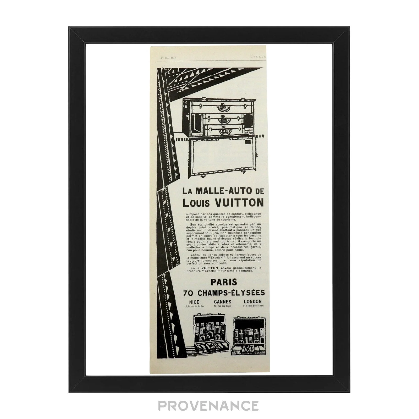 Louis Vuitton Antique Vintage Newsprint Ad - MALLE-AUTO 100% Authentic - Money Back Guarantee IDEAL INVESTMENT FOR ELEVATED HOME STAGING AND DECORATION Condition Notes: Professionally framed with archival materials Condition of printed matter excellent and consistent with age - Genuine c. 1920's vintage antique Louis Vuitton advertisement - Highly collectible, very few surviving pieces worldwide - Black ink on newsprint - Highly collectible Framed Dimensions: 44 x 34 x 1 cm. Please note that in order to preserve the item in optimal storage conditions, this piece is framed-to-order. Please allow 1-2 days for fulfillment. FREE EXPRESS SHIPPING HASSLE-FREE RETURNS