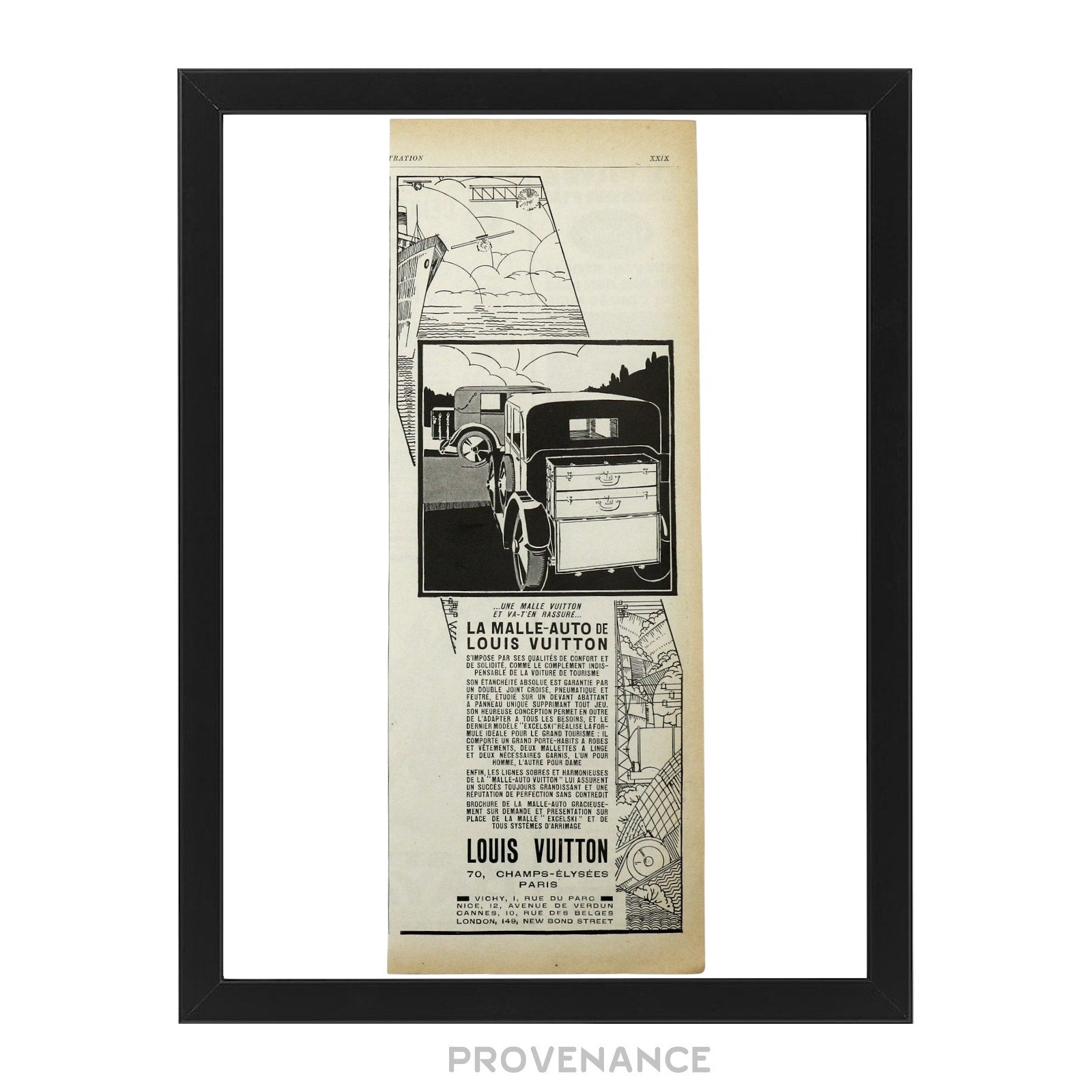 Louis Vuitton Antique Vintage Newsprint Ad - MALLE-AUTO 100% Authentic - Money Back Guarantee IDEAL INVESTMENT FOR ELEVATED HOME STAGING AND DECORATION Condition Notes: Professionally framed with archival materials Condition of printed matter excellent and consistent with age - Genuine c. 1920's vintage antique Louis Vuitton advertisement - Highly collectible, very few surviving pieces worldwide - Black ink on newsprint - Highly collectible Framed Dimensions: 44 x 34 x 1 cm. Please note that in order to preserve the item in optimal storage conditions, this piece is framed-to-order. Please allow 1-2 days for fulfillment. FREE EXPRESS SHIPPING HASSLE-FREE RETURNS