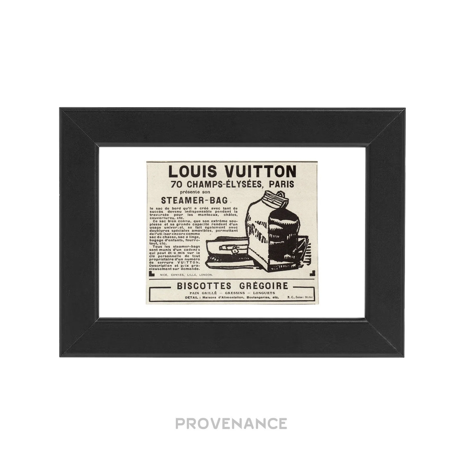 Louis Vuitton Antique Vintage Newsprint Ad - STEAMER-BAG 100% Authentic - Money Back Guarantee RARE SMALL FORMAT ANTIQUE LOUIS VUITTON ADVERTISEMENT IDEAL INVESTMENT FOR ELEVATED HOME STAGING AND DECORATION Condition Notes: Professionally framed with archival materials Condition of printed matter excellent and consistent with age - Genuine c. 1920's vintage antique Louis Vuitton advertisement - Highly collectible, very few surviving pieces worldwide - Black ink on newsprint - Highly collectible Framed Dimensions: 13 x 18 x 1 cm. Please note that in order to preserve the item in optimal storage conditions, this piece is framed-to-order. Please allow 1-2 days for fulfillment. FREE EXPRESS SHIPPING HASSLE-FREE RETURNS