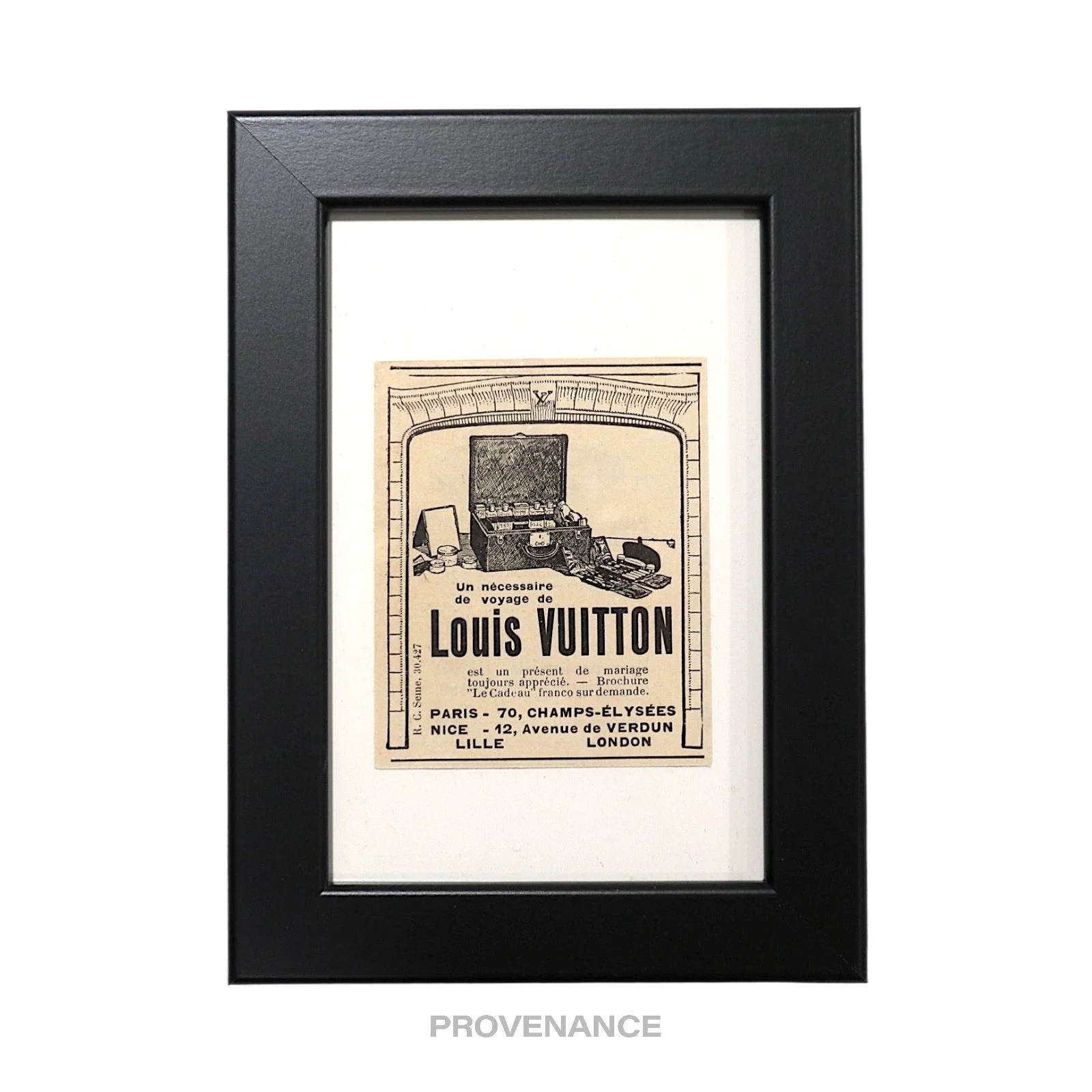 Louis Vuitton Antique Vintage Newsprint Ad - Travel Kit 100% Authentic - Money Back Guarantee RARE SMALL FORMAT ANTIQUE LOUIS VUITTON ADVERTISEMENT IDEAL INVESTMENT FOR ELEVATED HOME STAGING AND DECORATION Condition Notes: Professionally framed with archival materials Condition of printed matter excellent and consistent with age - Genuine c. 1920's vintage antique Louis Vuitton advertisement - Highly collectible, very few surviving pieces worldwide - Black ink on newsprint - Highly collectible Framed Dimensions: 13 x 18 x 1 cm. FREE EXPRESS SHIPPING SHIPS WITHIN 24HRS. HASSLE-FREE RETURNS
