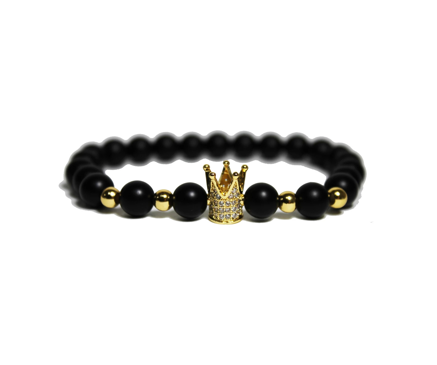 Bracelet - Crown & Matte Black Onyx 100% Authentic - Money-Back Guarantee - Crown and accent beads in 24K Gold finish - 8 mm. AAA matte black onyx beads - Pave set CZ stones - Approx. 7" circumference - Elasticized to fit any wrist size - Velvet pouch included FREE EXPRESS SHIPPING SHIPS WITHIN 24HRS. NO CUSTOMS FEES