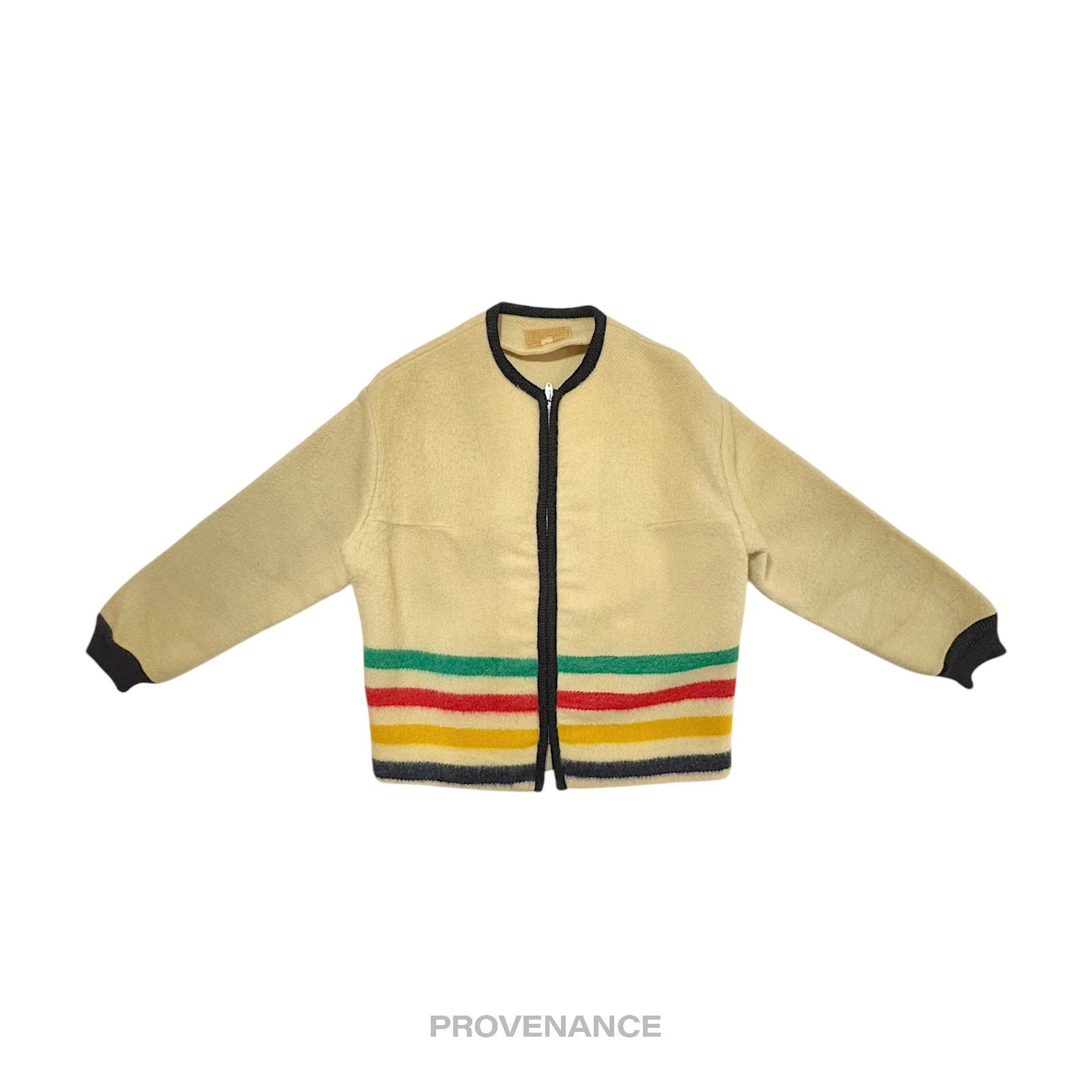 Hudson's Bay Company HBC Point Blanket Bomber Coat Wool M 100% Authentic - Money Back Guarantee ICONIC HBC POINT BLANKET STRIPE MOTIF RARE C. 1960's ERA PIECE Condition Notes: some signs of cosmetic wear consistent with age professionally cleaned - Iconic Point Blanket Multicolour stripe motif - 100% Wool - Ribbed cuffs - Original "LIGHTNING" zipper - Made in Canada FREE EXPRESS SHIPPING SAME-DAY SHIPPING HASSLE-FREE RETURNS