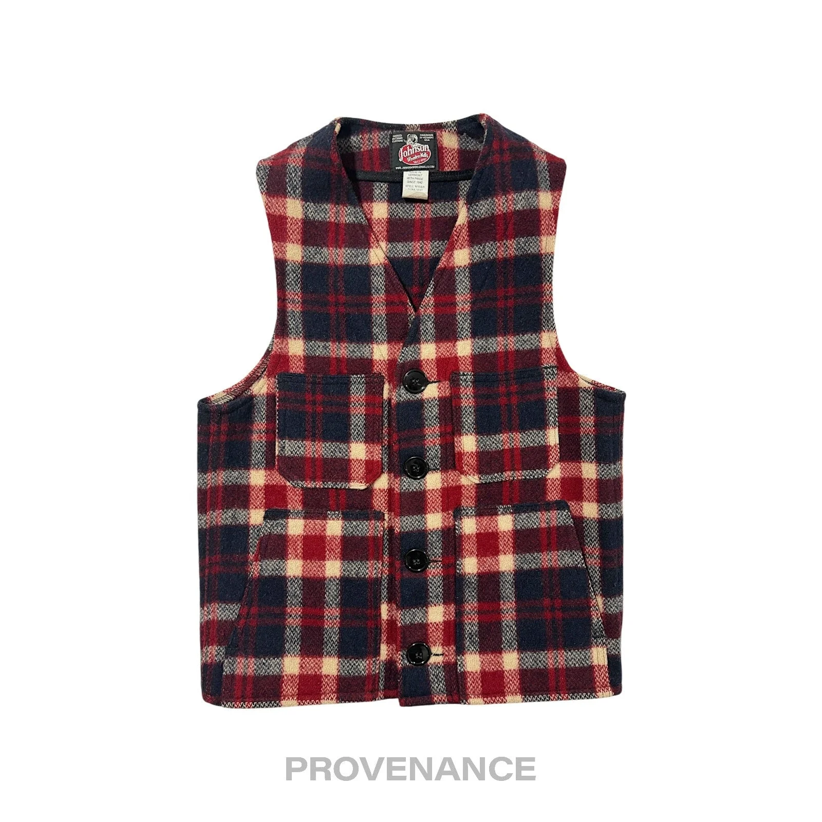 Johnson Woolen Mills Vest - Plaid XS 100% Authentic - Money Back Guarantee Condition Notes: Very minor signs of cosmetic wear Professionally cleaned Tagged size: XS, equivalent to 36 - Luxurious plaid 100% woolen fabric - 2 side-entry hand pockets - Fit for Field, Workwear, Everyday, Travel uses - Snap closure - Made in USA FREE EXPRESS SHIPPING SAME-DAY SHIPPING HASSLE-FREE RETURNS