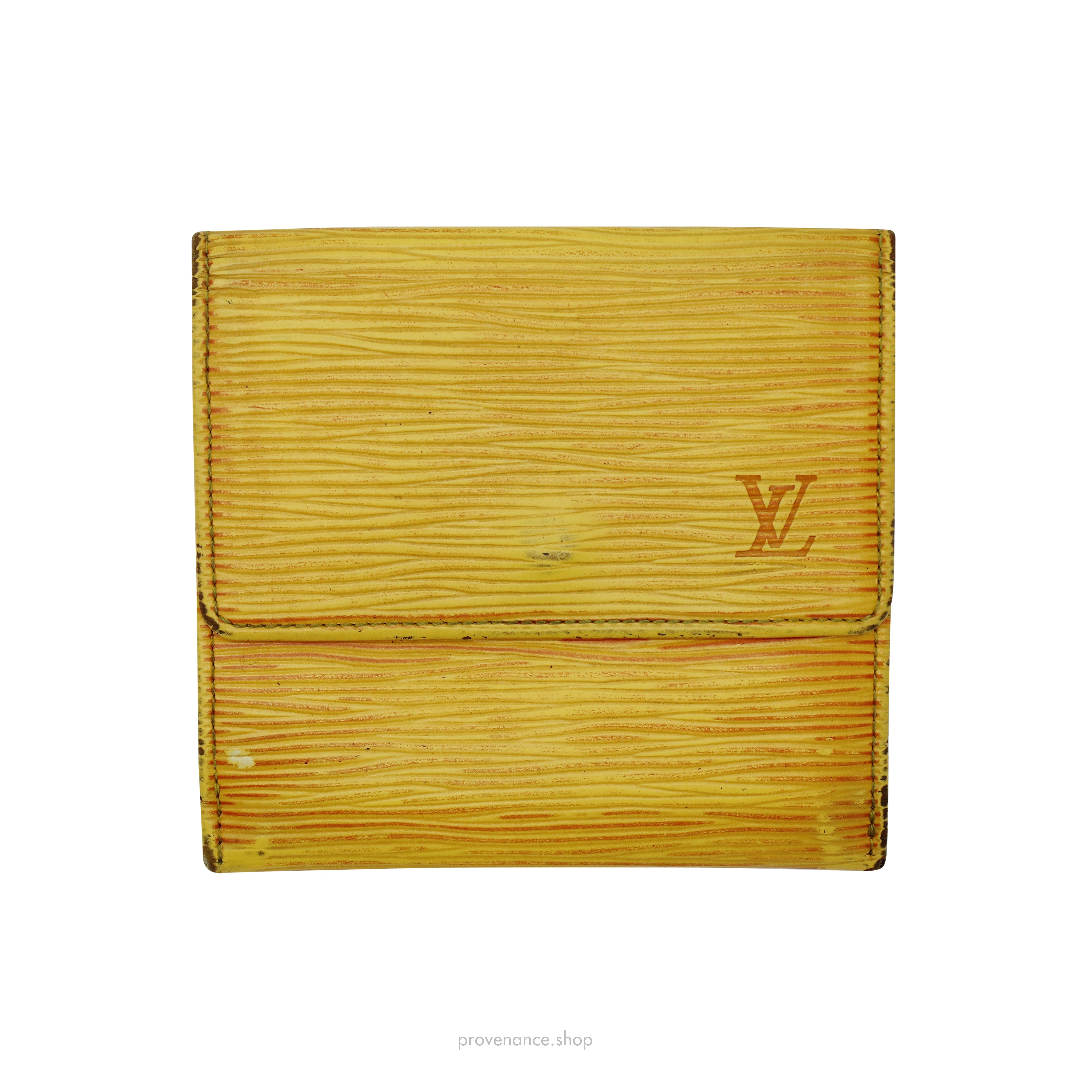 Louis Vuitton Elise Trifold Wallet in Tassil Yellow Epi Leather 100% Authentic - Money Back Guarantee Condition Notes: some signs of cosmetic wear Est. Retail: $785 - 4 card slots - 2 side slots - 1 bill compartment - 1 gusseted snap-closure compartment - Gold hardware - Contrasting Taiga leather lining FREE EXPRESS SHIPPING SHIPS WITHIN 24HRS.