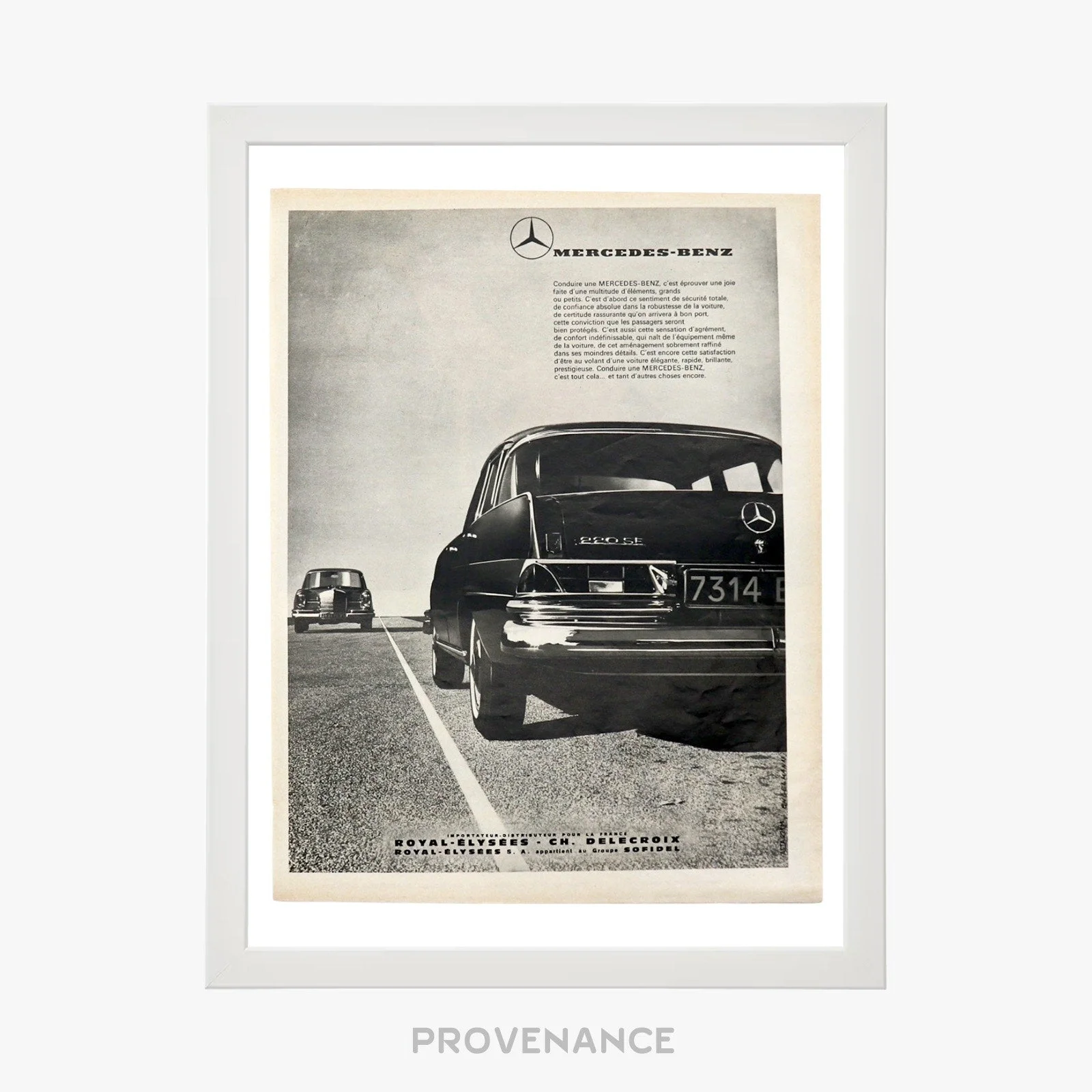 Mercedes-Benz Antique Vintage Newsprint Ad - 220 SE Car 100% Authentic - Money Back Guarantee IDEAL INVESTMENT FOR ELEVATED HOME STAGING AND DECORATION Condition Notes: Professionally framed with archival materials Condition of printed matter excellent and consistent with age - Genuine c. 1960 vintage Mercedes-Benz Advertisement - Highly collectible, very few surviving pieces worldwide - Black ink on newsprint - Highly collectible Framed Dimensions: 41 x 31 x 1 cm. Please note that in order to preserve the item in optimal storage conditions, this piece is framed-to-order. Please allow 1-2 days for fulfillment. FREE EXPRESS SHIPPING HASSLE-FREE RETURNS