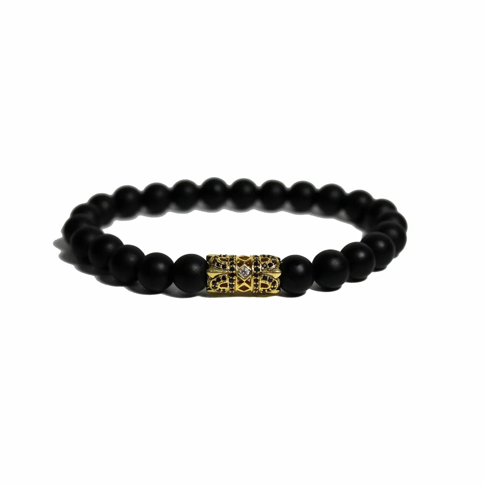 Regal Bracelet - Matte Onyx & Gold 100% Authentic - Money-Back Guarantee - 8mm. AAA stones - Princess cut centre CZ Diamond - CZ Diamond micro pave - Gold finish hardware - Approx. 7" circumference - Elasticized to fit any wrist size - Velvet pouch included FREE EXPRESS SHIPPING SHIPS WITHIN 24HRS.