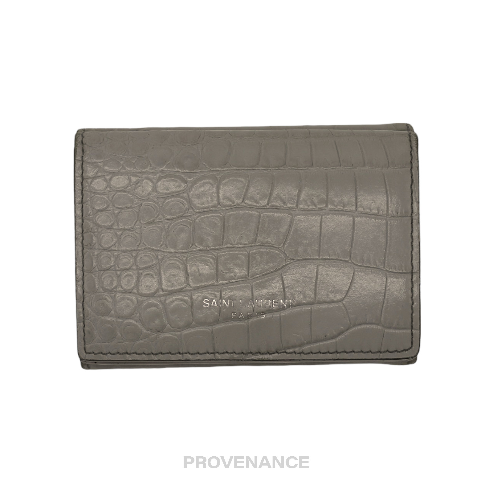 Saint Laurent Paris SLP Compact Snap Card Wallet - Gray Croc Leather 100% Authentic - Money-Back Guarantee ORIGINAL RETAIL BOX, DUST BAG INCLUDED Condition Notes: some signs of cosmetic wear - 3 card slots - 1 snap-closure compartment - 1 bill compartment - Logo stamp at exterior - Croc-embossed leather - Tonal leather lining - Silver hardware - Made in Italy FREE EXPRESS SHIPPING SHIPS WITHIN 24HR. HASSLE-FREE RETURNS