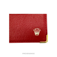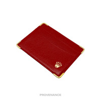 Rolex Card Holder Wallet - Red Leather II 100% Authentic - Money Back Guarantee Condition Notes: - Unused condition - some signs of minor cosmetic wear due to storage - slight variances between individual items may occur as more than one piece is available Dimensions: 11.75 x 9 cm. - 2 card slots - Rolex logo in gold foil at exterior - Gold hardware FREE EXPRESS SHIPPING SAME-DAY SHIPPING HASSLE-FREE RETURNS