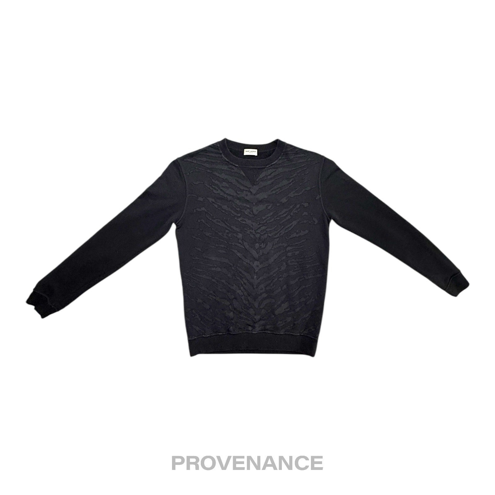 Saint Laurent Paris SLP Crewneck Sweatshirt Sweater- Black Tiger Stripe Applique 100% Authentic - Money Back Guarantee Condition Notes: some signs of cosmetic wear some areas of dicolouration professionally cleaned Tagged Size: S - Tiger stripe applique at obverse - 100% French Terry cotton - Relaxed fit - Ribbed cuffs and hem - Made in Italy FREE EXPRESS SHIPPING SAME-DAY SHIPPING HASSLE-FREE RETURNS