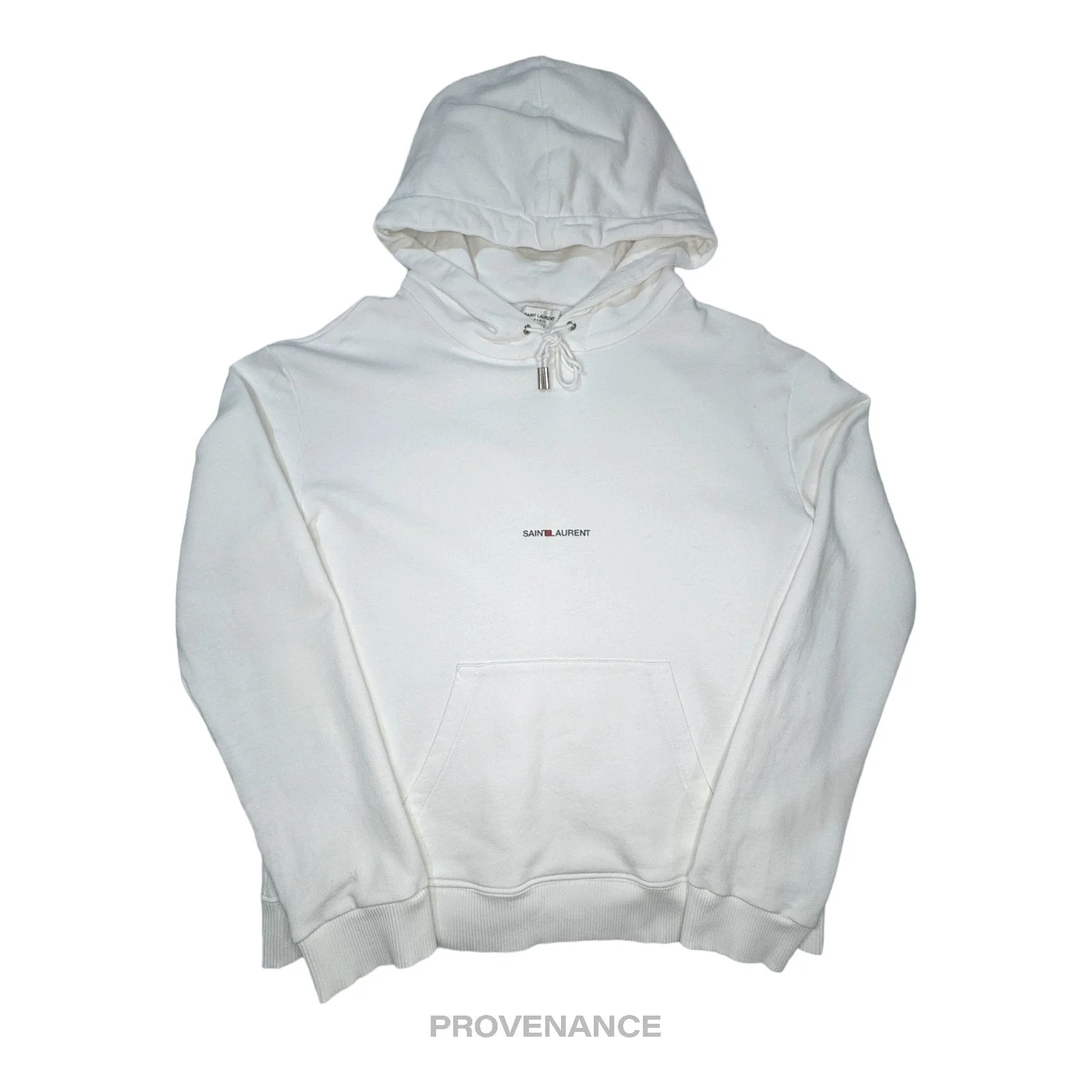 Saint Laurent Paris SLP Logo Hoodie - White 100% Authentic - Money Back Guarantee Condition Notes: some signs of cosmetic wear professionally cleaned Tagged Size: S - 100% French Terry cotton - Drawstring closure - Kangaroo pocket - Ribbed cuffs - Made in France FREE EXPRESS SHIPPING SHIPS WITHIN 24HR. HASSLE-FREE RETURNS