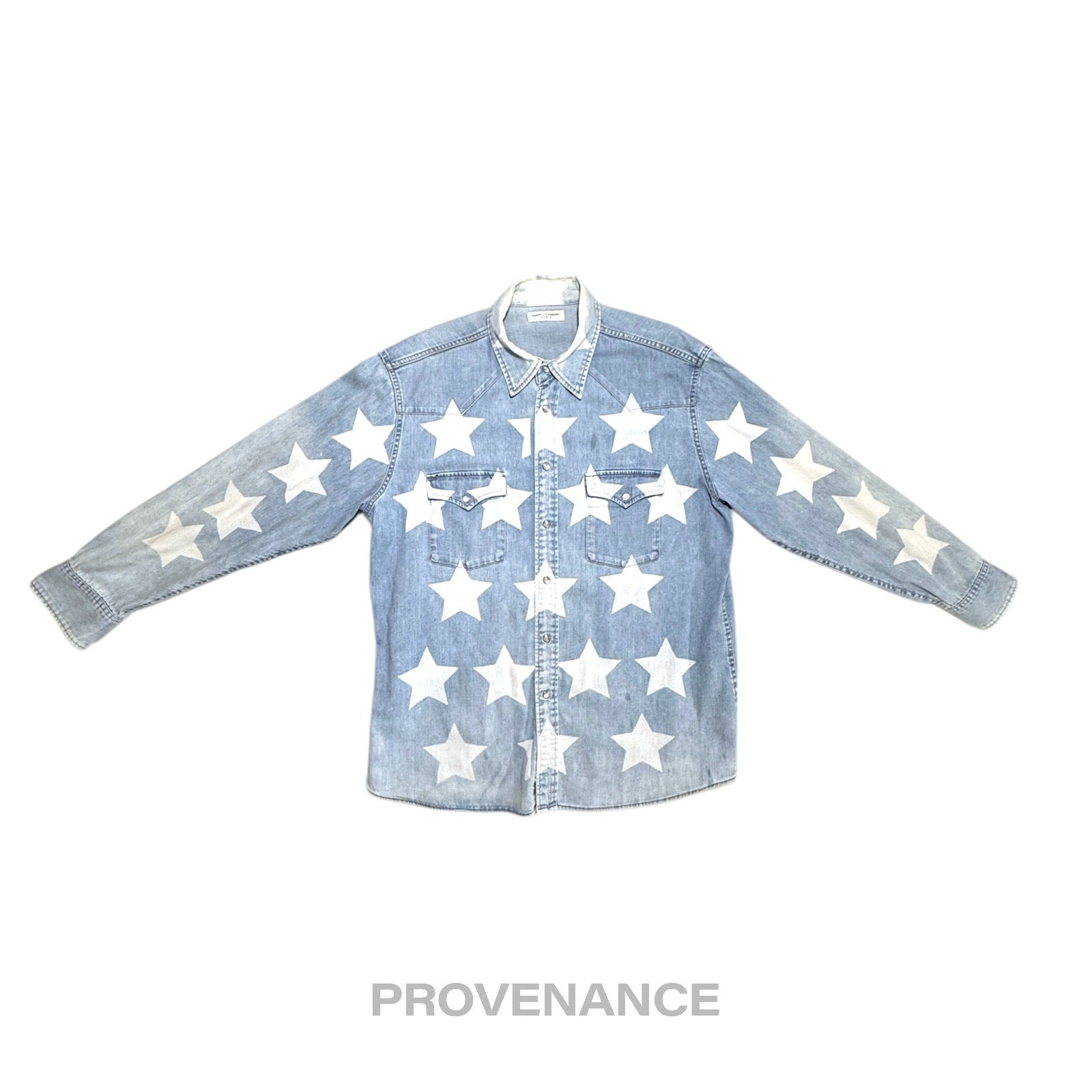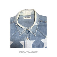 Saint Laurent Paris SLP Western Denim Shirt - Stars Blue S 100% Authentic - Money Back Guarantee Condition Notes: some signs of cosmetic wear some ares of discolouration (pictured) professionally cleaned Tagged Size: "S", 46 IT, 36/S US, 175cm. - Iconic stars motif printed - Western Shirt in Denim - Snap buttons in pearl finish - Two flap pockets with snap buttons - Western detailing - 100% Cotton - Made in Japan FREE EXPRESS SHIPPING SAME-DAY SHIPPING. HASSLE-FREE RETURNS