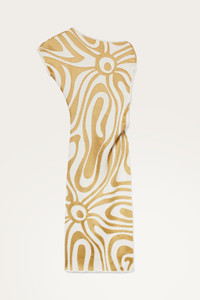A dress that knows how to make the most of you. This longuette combines elegance and practicality with its refined draping that gently drapes over the upper body, creating a feminine and sophisticated silhouette. The midi length makes it extremely versatile: perfect for an elegant cocktail party or a special evening out.The Marmo pattern, offered in a refined combination of ecru and gold, adds a touch of brightness, while the fabric offers a comfortable and flawless fit. Pair it with a pair of jeweled sandals or pumps to complete a look that definitely leaves its mark. - To offer you a unique Pucci garment, we use an all-over print that makes the product unrepeatable. Therefore, the pattern print may vary from the one displayed in the photo. - Ecru and gold - 81% Viscose, 14% Polyester, 4% Polyamide, 1% Elastane - Draping over the upper body - Midi length - Marmo print - Gently dry clean. - Made in Italy - ID: 5HKH925H956A54 - The model is 178 cm tall and wears a 38 italian size.