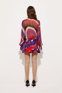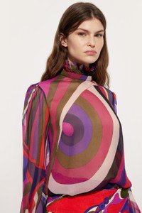 With a retro and sophisticated spirit, this blouse adds a touch of understated drama to the contemporary wardrobe. The high gathered collar and balloon sleeves with structured cuffs evoke 1960s elegance, while the lightness of the fabric creates a delicate play of transparencies. The iconic multicolor Iride print, defines a graphic and enveloping look. - To offer you a unique Pucci garment, we use an all-over print that makes the product unrepeatable. Therefore, the pattern print may vary from the one displayed in the photo. - Multicolor - 100% silk - Gathered high collar - Balloon sleeves with cuffs - Flowing, feminine fit - Dry clean only - Made in Italy - ID: 5URM465U872011