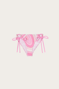 A must-have in your summer wardrobe, this bikini bottom with adjustable side ties fit your shape perfectly, offering comfort and impeccable style. The Iride print in pink adds a touch of sophistication, while the stretchy lycra with anti-UV treatment provides protection and durability, making them ideal for both the beach and the pool. Pair them with the matching top for a total Pucci look. - To offer you a unique Pucci garment, we use an all-over print that makes the product unrepeatable. Therefore, the pattern print may vary from the one displayed in the photo. - Pink - 80% Polyamide, 20% Elastane - Adjustable side ties - Stretchy Lycra with anti-UV treatment - Hand wash. - Made in Italy - ID: 5HMX265H855057 - Model is 178 cm tall and wears Italian size 38.