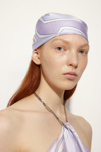 Can such a small and subtle accessory be a big statement? Absolutely. This printed silk twill square is a tribute to iconic Pucci prints, reinterpreted in a delicate lavender palette. With its compact size, it's the perfect accessory to add a distinctive touch to any outfit. Tie it around your neck for a classic look, use it as a hair accessory or as a decoration for your bag: its versatility makes it a must-have for every wardrobe. A piece that celebrates the art of detail and the timeless elegance of the brand. - Lavender - Silk - Dimensions: 52x52 cm - Dry clean only. - Made in Italy - ID: 5UGB515UC282
