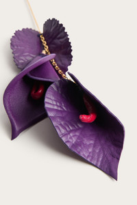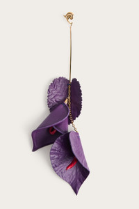 A dramatic piece of jewelry that encapsulates all of Pucci's creativity. This single pendant earring combines iconic and textural elements: the Pucci fish as a button, a central metal stick, and thin chains ending in three leather flowers with a light and playful movement. The shiny gold finish adds brightness and makes this piece perfect for completing an elegant look with an artistic and unexpected touch. - Black and Purple - Material: Brass - Polished gold finish - Mono earring pendant - Pucci fish like button - Chains with 3 leather flowers - Stiff metal center element - Not washable - Made in Italy - ID: 5UAL305U920N05
