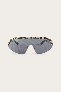 Futuristic and unmistakable, these wrap-around sunglasses express Pucci style with a bold, contemporary design. The Marmo motif, one of the brand's most iconic, starts from the edge of the frame and elegantly extends along the metal temples until it merges with the smoked mirrored lenses, for a graphic and fluid effect that catches the eye.A bold model that reinterprets the sports mask with a couture touch, designed for those looking for accessories with a strong visual impact. - Black and smoke mirror - Metal - Mask frame - Marmo motif on frame, temples and lenses - Smoked mirrored lenses - Metal temples - Shaped temples - ID: EP0237M000005C