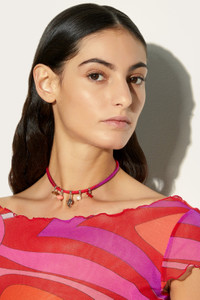 A refined detail that expresses the essence of Pucci's iconic style. This silk choker features a tubular design embellished with a Marmo print in vibrant shades of coral and fuchsia. Brass pendants, including the iconic fish symbol of the maison, add a distinctive touch, while natural pearls lend sophisticated elegance. A versatile accessory, perfect for completing any look with character. - Coral and fuchsia - Main material: silk - Brass and natural pearl pendants - Made in Italy - ID: 5HAM315H761006