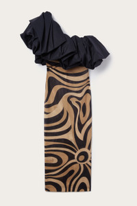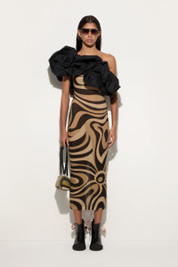 A perfect balance of elegance and modernity. This straight-cut long dress is distinguished by its asymmetrical neckline, which leaves one shoulder uncovered, while a single puff sleeve wraps around the chest with volume and lightness. Made of lightweight cotton poplin, it gives a fluid and comfortable fit. Black enhances its refined design, perfect for those who love a sophisticated style with a touch of originality, in perfect Pucci style. - To offer you a unique Pucci garment, we use an all-over print that makes the product unrepeatable. Therefore, the pattern print may vary from the one displayed in the photo. - Black - Asymmetrical neckline with one uncovered shoulder - Single puff sleeve - Straight cut - Main fabric: 100% Cotton - Body: 84% Polyamide, 16% Elastane - Wash gently max 30°C. - Made in Italy. - Model is 176 cm tall and wears Italian size 38. - ID: 5HRI105H603999